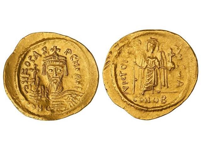 Sólido. FOCAS (602-610). CONSTANTINOPLA. Anv.: d.N.FOCAS PERP. AVG. Busto de frente coronado y acorazado sosteniendo globo crucífero. Rev.: VICTORIA AVG¶A. Ángel en pie de frente. En exergo: CONOB. AU. (Parte del reverso acuñado en anverso). Se-620. EBC-/MBC+.