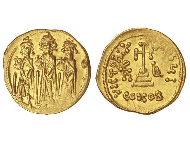 Sólido. - HERACLIO (610-641). - CONSTANTINOPLA. - Anv.: Heraclio, Constantino y Heraclonas en pie de frente. Rev.: VICTORIA (AVG)¶I. En exergo: CONOB. AU. (Graffiti en reverso). Se-767. EBC-/MBC+. - -