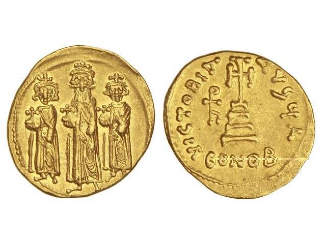 Sólido. HERACLIO (610-641). CONSTANTINOPLA. Anv.: Heraclio, Heraclio Constantino y Heraclonas, en pie de frente. Rev.: VICTORIA AV¶A. Cruz sobre tres escalones. En campo a izquierda monograma. En exergo: CONOB. 4,50 grs. AU. Se-763. <