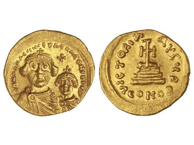 Sólido. - HERACLIO (610-641). - CONSTANTINOPLA. - Anv.: d. NN. h¶RACLI¶S. ¶T. h¶RA. CONST. PP. AV. Busto de frente de Heraclio y Heraclio Constantino. Rev.: VICTORIA AVG¶. Cruz sobre tres escalones. En exergo: CONOB. AU. (Pequeñas rayitas en reverso). Se-734. EBC-. - -