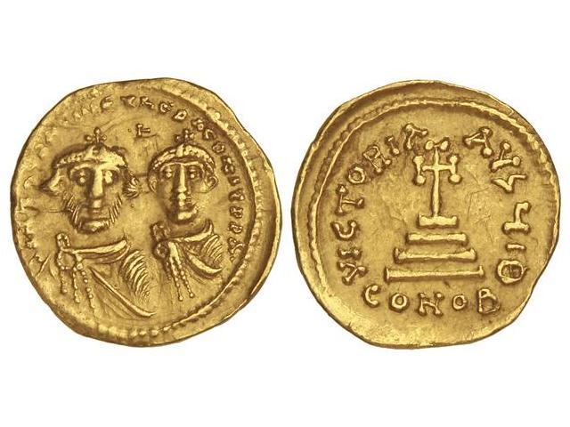 Sólido. - HERACLIO (610-641). - CONSTANTINOPLA. - Anv.: dd. NN. h¶RACLI¶S ¶T h¶RA. CONST. P. P. A. Busto de frente de Heraclio y Heraclio Constantino. Rev.: VICTORIA AVG¶I¶. Cruz sobre tres escalones. En exergo: CONOB. 4,30 grs. Se-746. MBC/MBC+. - -