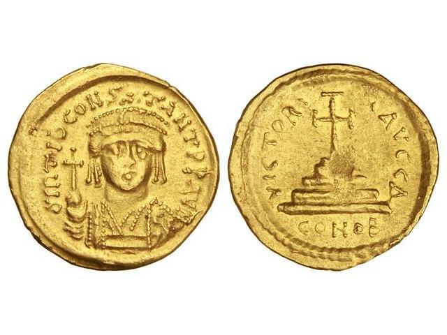Sólido. TIBERIO II CONSTANTINO (578-582). CONSTANTINOPLA. Anv.: ¶. TIb. CONSTANT. PP. AVI. Busto coronado y acorazado de frente, sosteniendo globo crucífero. Rev.: VICTORIA AVGG. A. Cruz sobre 4 escalones. 4,40 grs. AU. (Defecto de ac