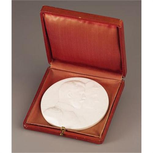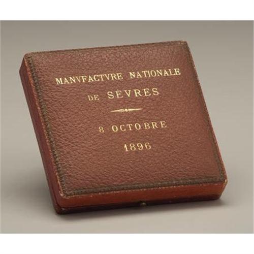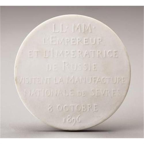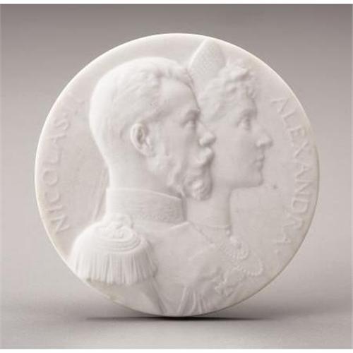 <B>Sèvres Bisque Porcelain Nicholas and Alexandra Medallion Commemorating their Visit to the Factory</B></I><BR><I>French, circa 1896</B></I><BR><BR>Of white porcelain, depicting the Imperial couple facing right, he in military uniform, she wearing a <I>kokoshnik, </B></I>inscribed <I>NICHOLAS II </B></I>and <I>ALEXANDRA</B></I>, the reverse inscribed <I>LL MM L'EMPEREUR ET L'EMPERATRICE DE RUSSIE VISITENT LA MANUFACTURE NATIONALE DE SEVRES, 8 OCTOBRE 1896</B></I>-3 1/2 in. diam. in original red leather box, the top embossed <I>MANUFACTURE NATIONALE DE SEVRES</B></I> and dated<BR><BR>Provenance:<BR>Purchased from St. Petersburg Shop, Paris<BR><BR><b>Shipping:</b> Requires 3rd Party Shipping (<a target="_blank" href="http://www.heritageauctions.com/common/shipping.php">view shipping information</a>)