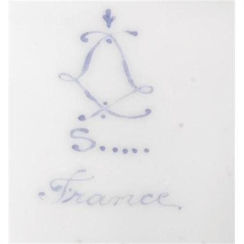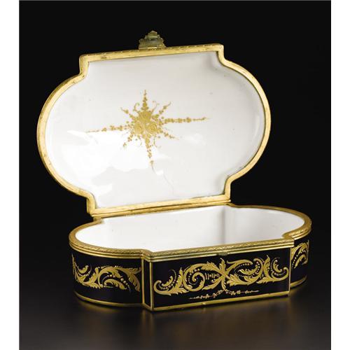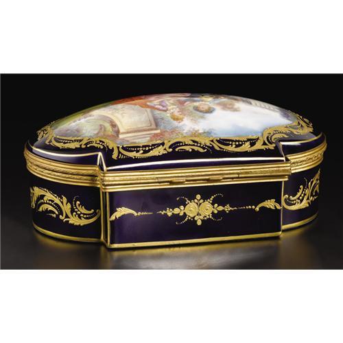 <B>A Sèvres-style Porcelain and Gilt-Metal Box</B></I><BR><BR>Unknown maker, painted by Lauque, France<BR>Late Nineteenth/Early Twentieth Century<BR>Porcelain with polychrome enamel and gilt decoration; gilt metal<BR>Marks: interlaced <I>L</B></I>'s above <I>S….., France</B></I><BR>4 inches high x 9 inches wide x 6.13 inches deep<BR><BR>Of rectangular form with D shaped ends with dark blue ground, the lid with a musical couple within a garden landscape edged with gilt scroll work; the sides with gilt scroll work; interior with gilt floral sprays; gilt metal mounts. <B>Condition Report:</B> Restoration to lid.<BR><BR><b>Shipping:</b> Requires 3rd Party Shipping (<a target="_blank" href="http://www.heritageauctions.com/common/shipping.php">view shipping information</a>)