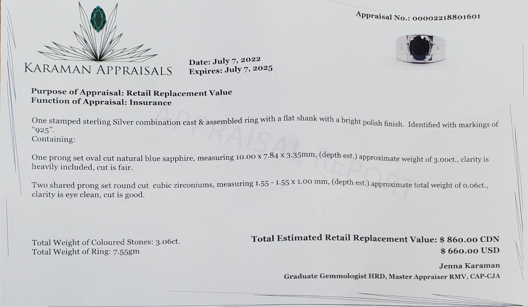 SILVER, NATURAL BLUE SAPPHIRE(3CT) 2 CZ(0.06CT) RING SIZE 9, WEIGHT 7.55G, APPRAISED RETAIL $860 **ALL ITEMS MUST BE REMOVED BY 5PM SATURDAY, JANUARY 21ST 2023. ALL MAGIC SPACE ITEMS MUST BE REMOVED BY WEDNESDAY, JANUARY 18TH AND ARE LOCATED AT 9058-22 AVENUE SW #102. **ALL REMAINING ITEMS WILL BE SUBJECT TO A $6.00 PER DAY STORAGE CHARGE. ANY ITEMS REMAINING AFTER MONDAY, FEBRUARY 6TH, 2023 WILL BE CONSIDERED FORFEITED. NO REFUNDS WILL BE ISSUED FOR FORFEITED ITEMS. TO SCHEDULE A PICK UP APPOINTMENT CLICK HERE