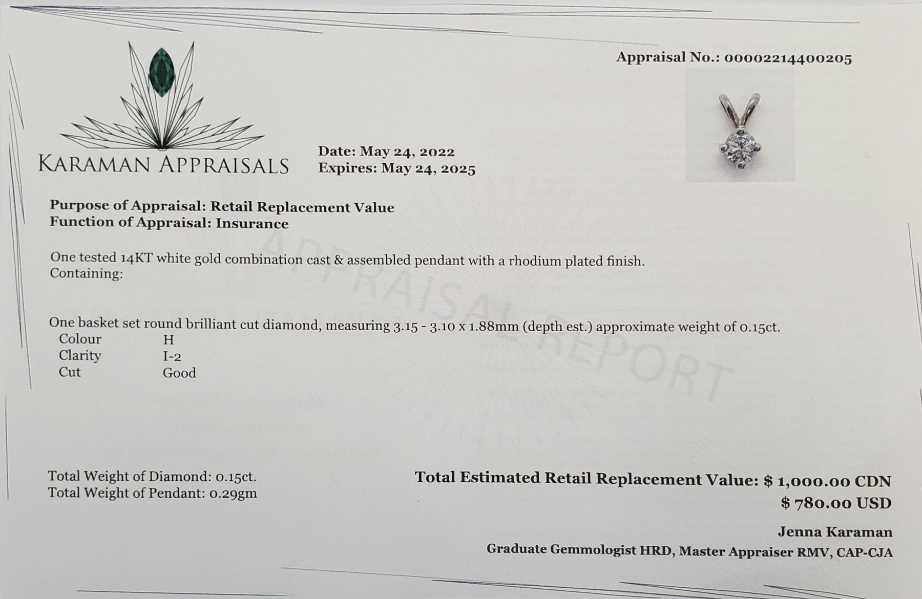 14K WHITE GOLD, DIAMOND (.15CT, I2, H), PENDANT WEIGHT 0.29G, APPRAISED RETAIL $1000 **ALL ITEMS MUST BE REMOVED BY 5PM SATURDAY, JANUARY 21ST 2023. ALL MAGIC SPACE ITEMS MUST BE REMOVED BY WEDNESDAY, JANUARY 18TH AND ARE LOCATED AT 9058-22 AVENUE SW #102. **ALL REMAINING ITEMS WILL BE SUBJECT TO A $6.00 PER DAY STORAGE CHARGE. ANY ITEMS REMAINING AFTER MONDAY, FEBRUARY 6TH, 2023 WILL BE CONSIDERED FORFEITED. NO REFUNDS WILL BE ISSUED FOR FORFEITED ITEMS. TO SCHEDULE A PICK UP APPOINTMENT CLICK HERE