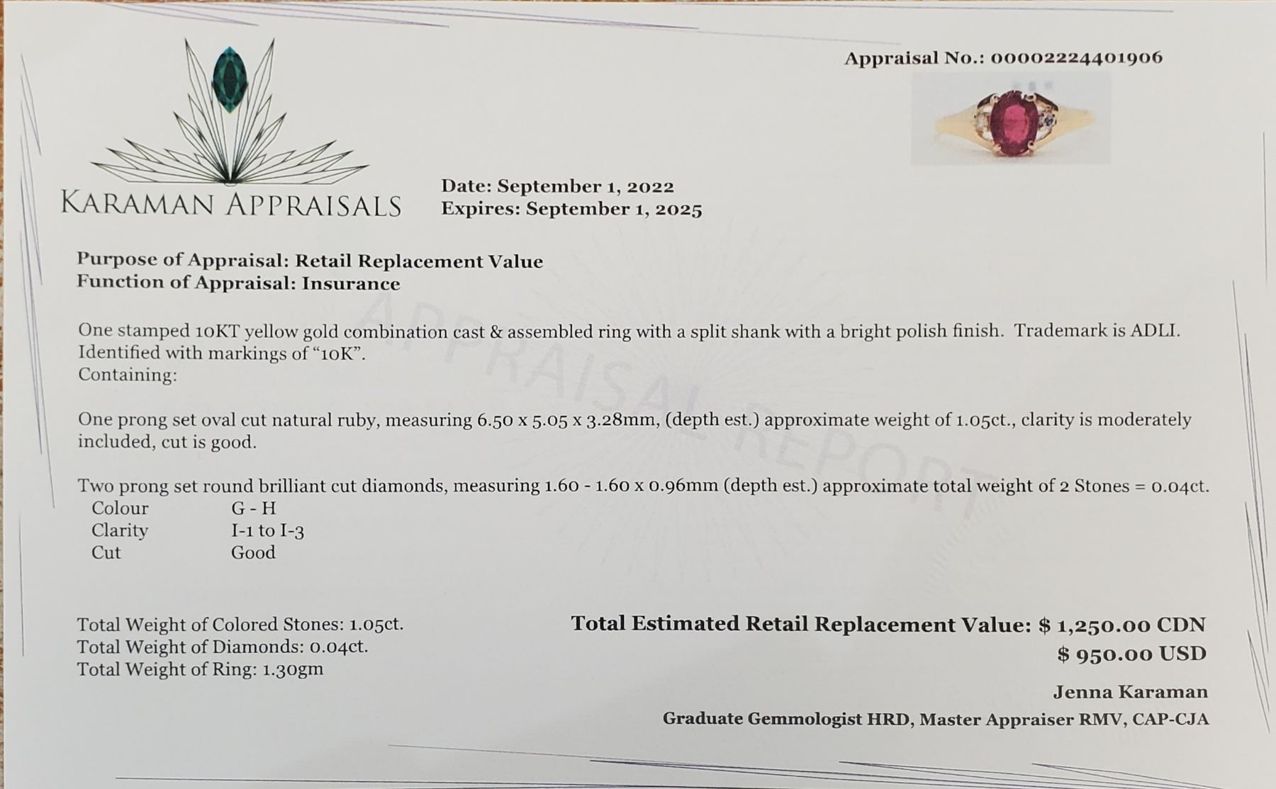 10K YELLOW GOLD, NATURAL RUBY(1.05CT) DIAMOND(0.04CT) RING SIZE 7, WEIGHT 1.3G, MADE IN CANADA, APPRAISED RETAIL $1250