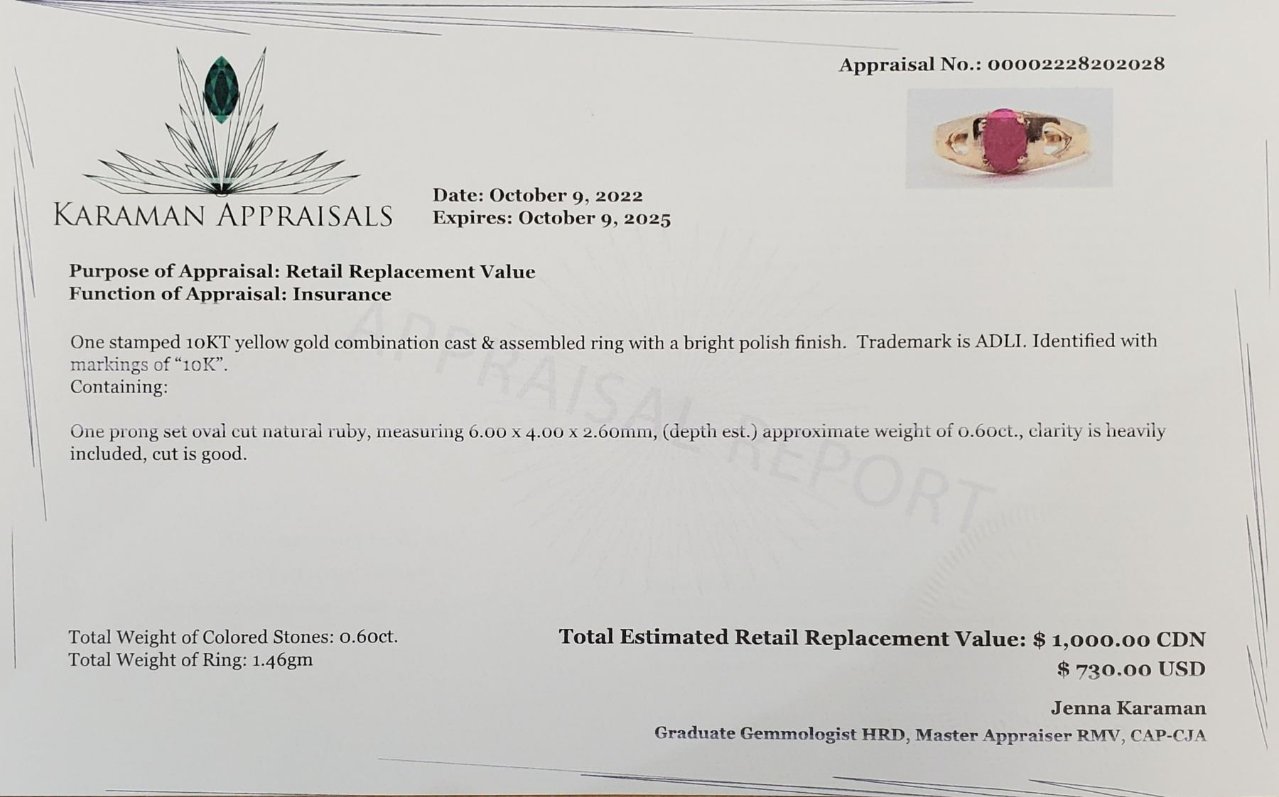 10K YELLOW GOLD, NATURAL RUBY(0.6CT) RING SIZE 4.5, WEIGHT 1.46G, MADE IN CANADA, SUGGESTED RETAIL VALUE $1000