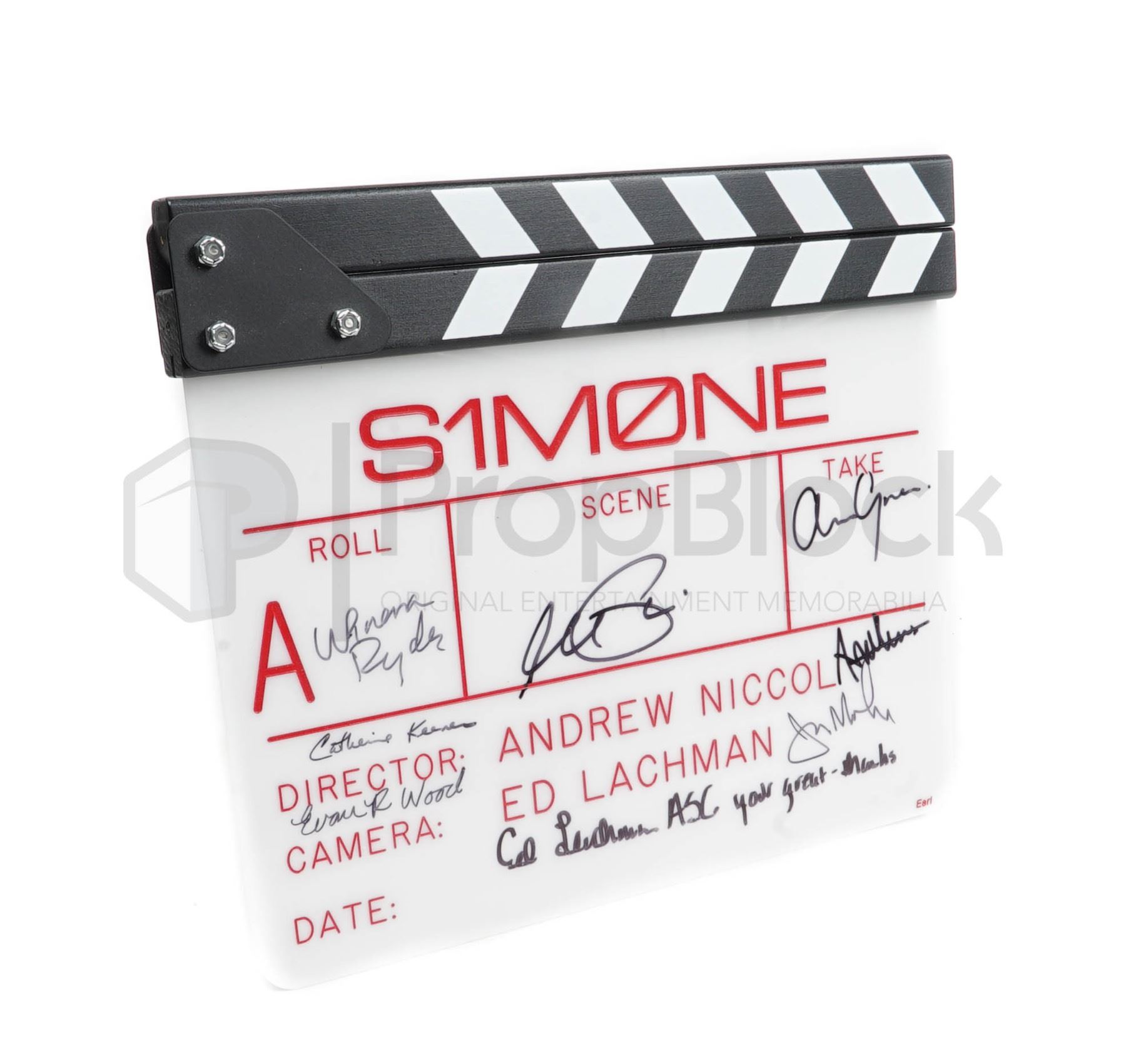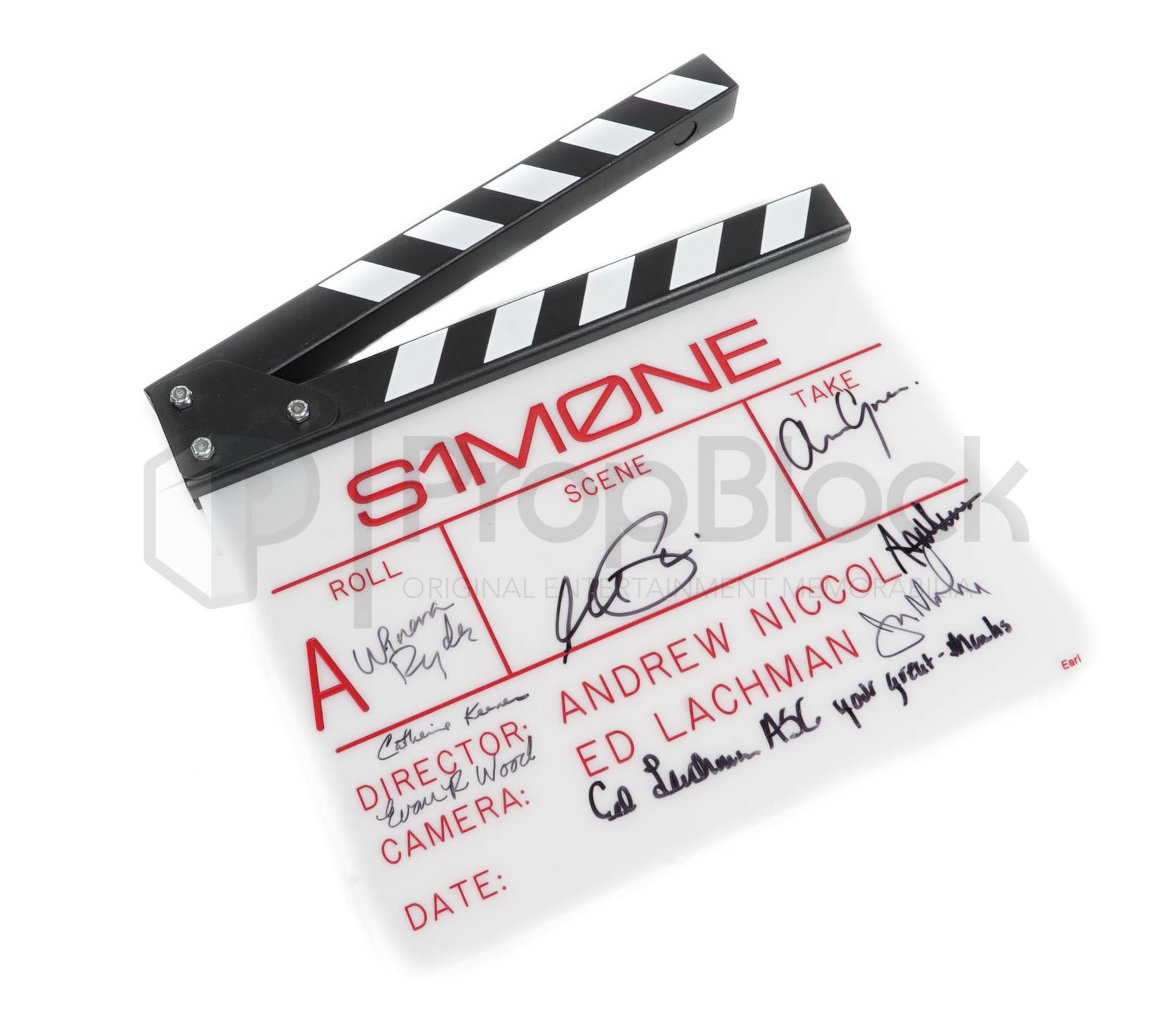 Clapper board use din the production of the 2002 science fiction comedy film S1mone. A producer's film is endangered when his star walks off, so he decides to digitally create an actress to substitute for the star, becoming an overnight sensation that everyone thinks is a real person. This white clapper features a black and white striped wooden top and the films logo indented into the front. The clapper has been sign by the principal cast on the front in black ink and remains in excellent, production used condition.