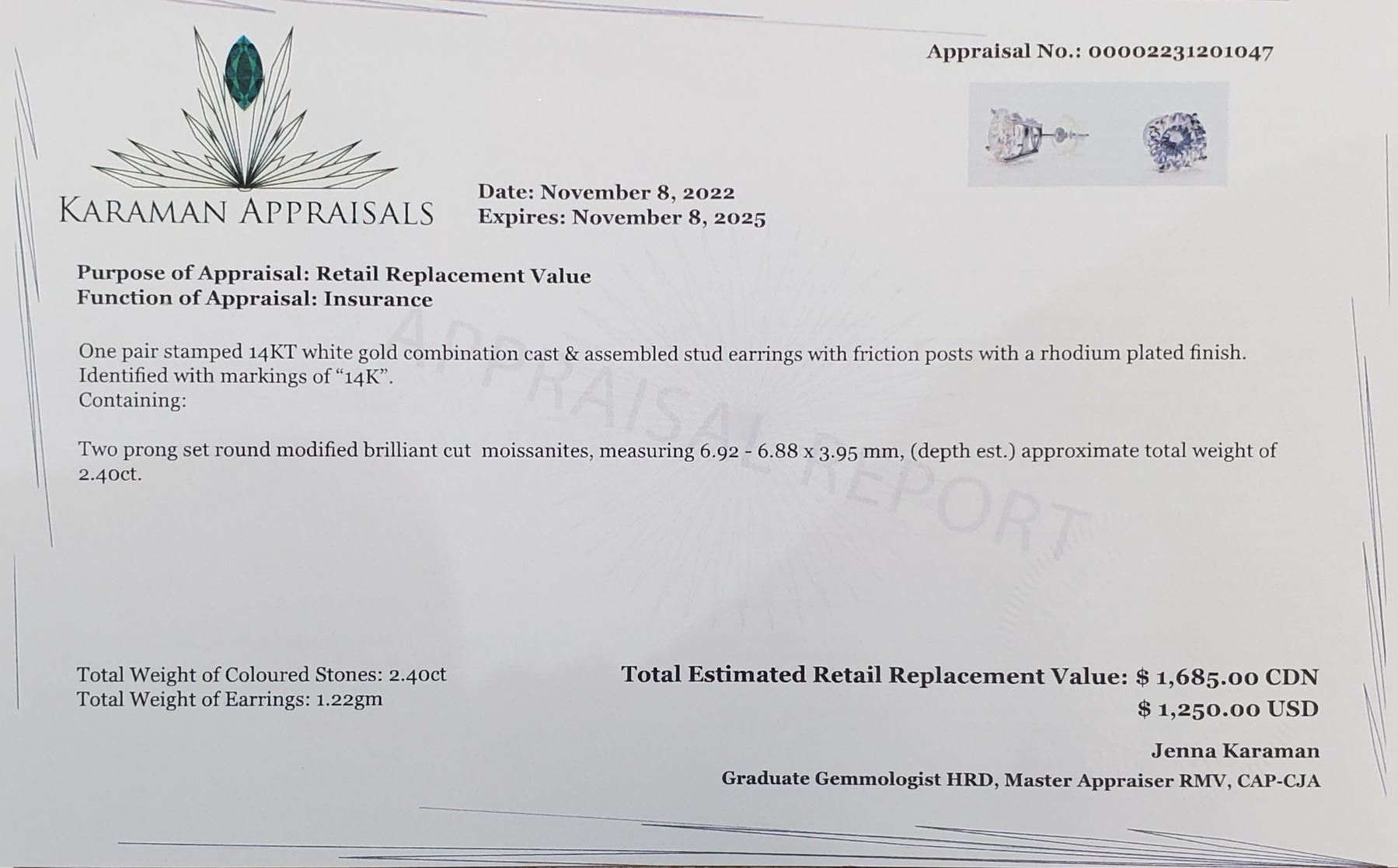 14K WHITE GOLD MOISSANITE(2.4CT) EARRINGS WEIGHT 1.22G, MADE IN CANADA, APPRAISED RETAIL $1685 **ALL ITEMS MUST BE REMOVED BY 5PM SATURDAY, JULY 8ST 2023. ALL REMAINING ITEMS WILL BE SUBJECT TO A $6.00 PER DAY STORAGE CHARGE. ANY ITEMS REMAINING AFTER MONDAY, JULY 24TH, 2023 WILL BE CONSIDERED FORFEITED. NO REFUNDS WILL BE ISSUED FOR FORFEITED ITEMS. TO SCHEDULE A PICK UP APPOINTMENT CLICK HERE