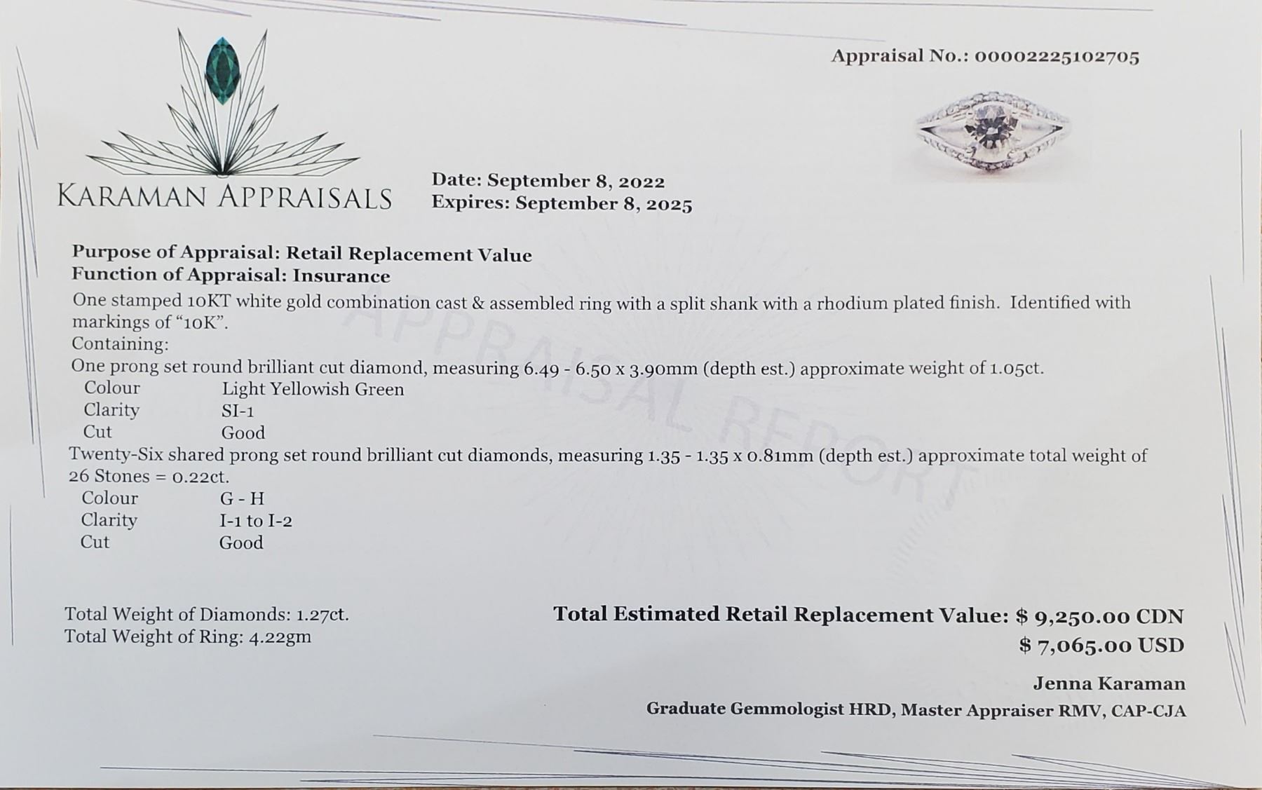 10K WHITE GOLD, LIGHT YELLOWISH GREEN DIAMOND (1.05CT, SI1) 26 SIDE MOISSANITE(0.22CT) RING SIZE 6, WEIGHT 4.22G, MADE IN CANADA, APPRAISED RETAIL $9250 **ALL ITEMS MUST BE REMOVED BY 5PM SATURDAY, JANUARY 28TH 2023. **ALL REMAINING ITEMS WILL BE SUBJECT TO A $6.00 PER DAY STORAGE CHARGE. ANY ITEMS REMAINING AFTER MONDAY, FEBRUARY 13TH, 2023 WILL BE CONSIDERED FORFEITED. NO REFUNDS WILL BE ISSUED FOR FORFEITED ITEMS. TO SCHEDULE A PICK UP APPOINTMENT CLICK HERE