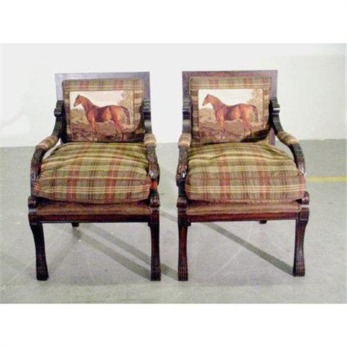 Needlepoint and Suede Thoroughbred Chairs. Lovely pair of chairs with needlepoint rendition of a thoroughbred horse in the center of each back cushion. Seat cushions come out and bottom of chair is suede. Wonderful for any horse lover! Also available individually for $1,950.00 USD per chair.