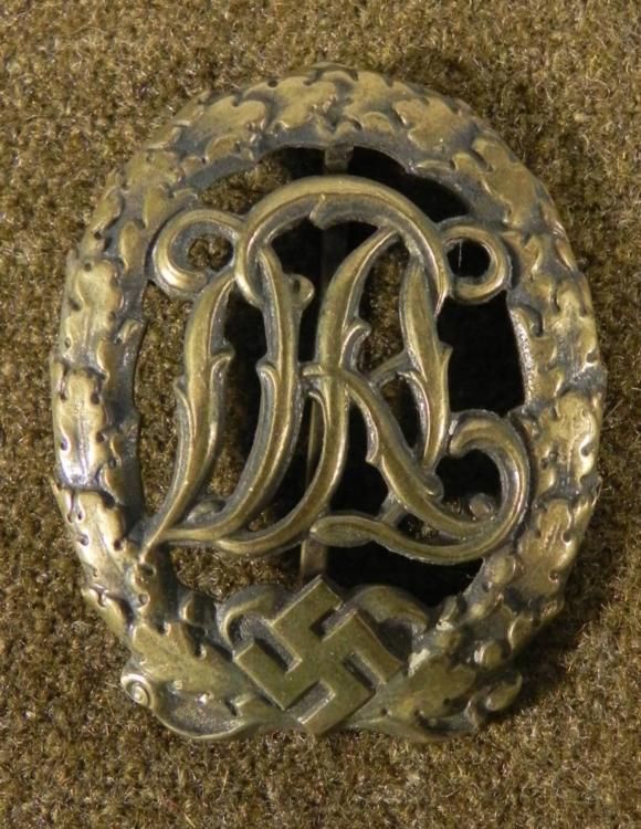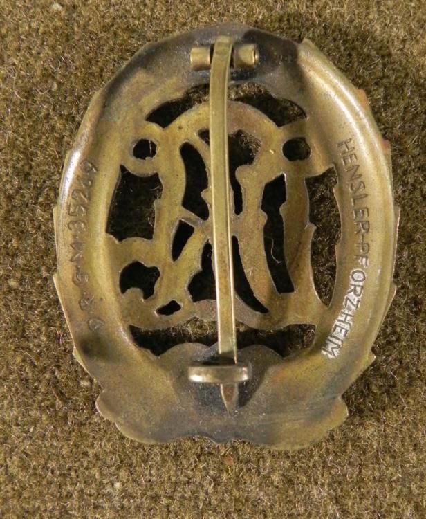 SA "DRL" NAZI SPORTS BADGE-ORIG-BRONZE-WREATH & SWASTIKA-MARKED W/MAKER & # * GREAT ORIGINAL SA SPORTS BADGE AWARD-EARLY PIECE-WIDE PIN-REVERSE MARKED "DRGM-35269--HENSLER-PFORZHEIM" *