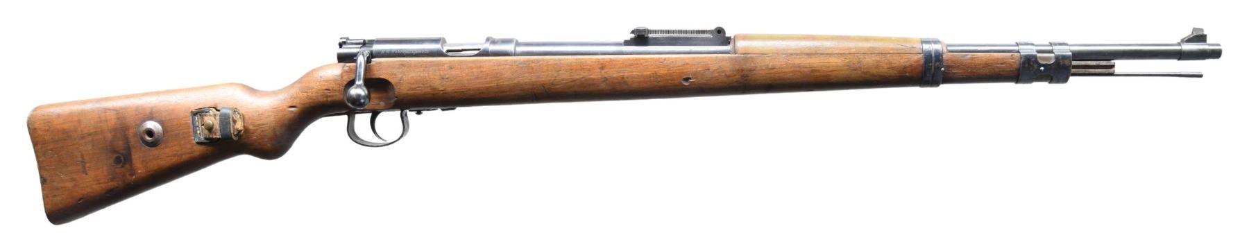 Cal. 22 LR. S# 248193. Bbl. 26". Blade front sight. Tangent rear sight graduated to 200m. Bolt has electro pencil matching number to bbl. Rear sight base & leaf appear to be both numbered "98". Receiver ring has standard Gustloff markings. Left side of bbl. & receiver both have eagle "N" proofs. Blued finish. Walnut stock with left side sling provisions & leather sling that appears original. Left side of butt has strong SA "SAd. NSDAP" roundel. Left side of stock disc has unit marking that reads "St.6/70.". Cleaning rod present. CONDITION: stock shows scattered dings, handling marks & a few black stain spots. Buttplate shows overall oxidation. Balance of metal retains 50% original blue with a few scratches on trigger guard, scattered oxidation patches along the exposed edges, fading, edge wear & handling marks. Action functions properly when hand cycled. Very good bright bore. (25-4262/MJC). CURIO. $1,000-1,500.