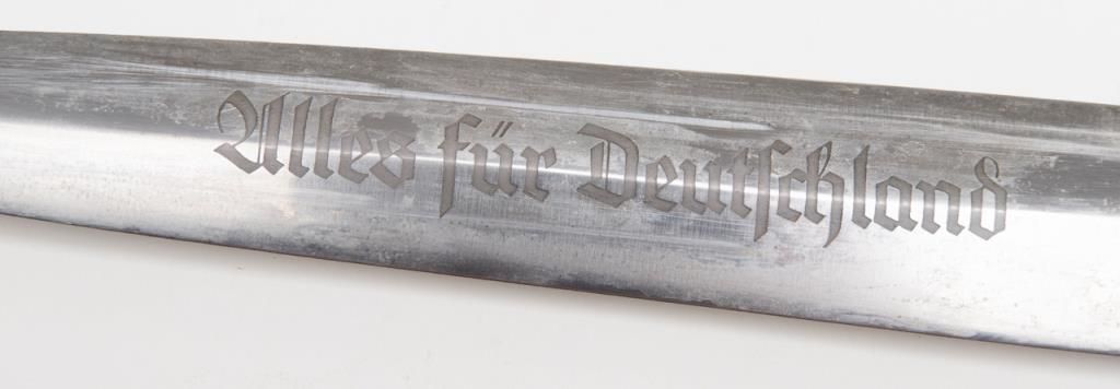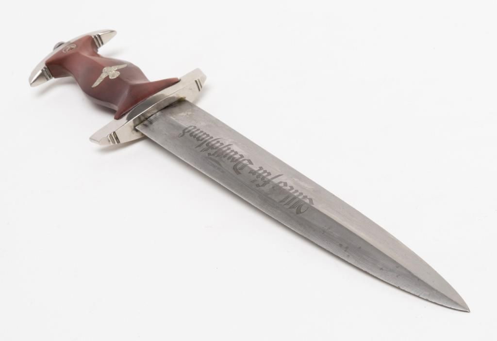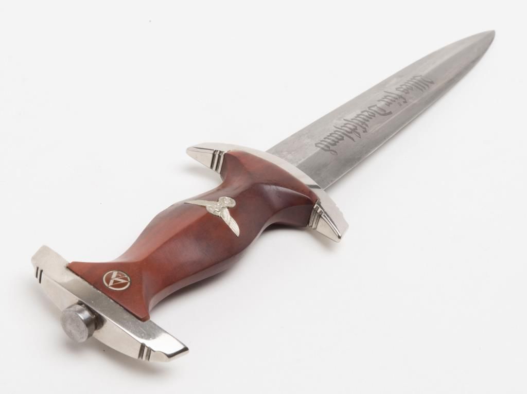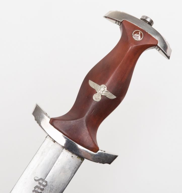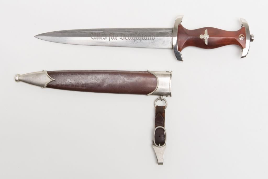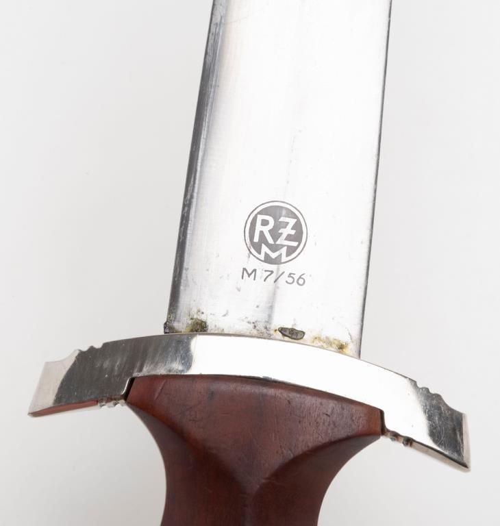 SA Nazi Wood handled Dagger with leather hanger and clip. The engraved blade is marked, “RZM” and “M 7/56”. The knife is in overall very good condition, with scabbard. (Exempt). Est.: $300-$600.