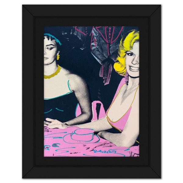 "Sophia Loren and Jane Mansfield" is a one-of-a-kind hand-pulled mixed media silkscreen on canvas by Ringo (Daniel Funes) - protege of And...