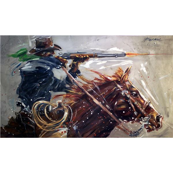 A lover of Classic Westerns from TV & movies , Michael Bryan has created this 23x40" handworked giclee on canvas, numbered 1/1 Unique.