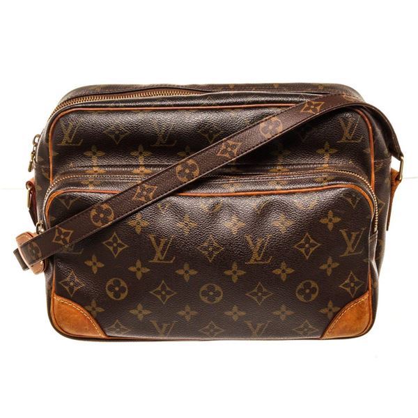 Louis Vuitton Brown Monogram Nile Crossbody Bag with material monogram canvas, gold-tone hardware, tan vachetta leather trim, exterior zip pockets, in