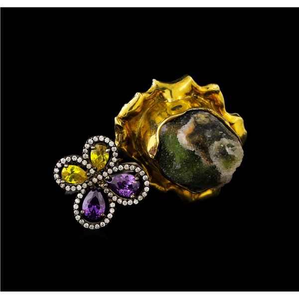One of a kind high fashion sterling silver Ring weighing 19.9 grams. Black Antique texture. Containing: Crystal Green Lace Agate, White Crystal, Purpl