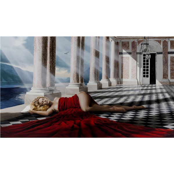 DELLORCO is the spectator in the Palace of her Dreams , taking place beyond the curtain of consciousness in this 40"x24" giclee on canvas,
