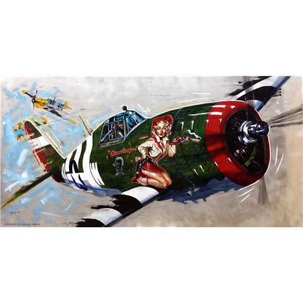 Michael Bryan's WWII fighter is adorned with a cowgirl pin-up as it heads into battle. A Unique 20x40" hand-worked giclee on canvas, it is ...