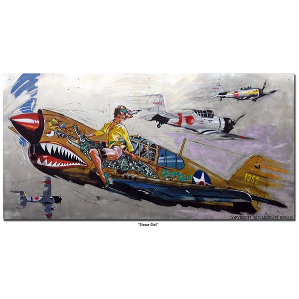 A Unique hand-embellished giclee on canvas featuring a WWII fighter jet by Michael Bryan. It is 20x40" numbered 1/1 w/COA from Artist..