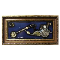 "Vintage Motorcycle" is a framed original collage on wood panel by Zaza Koreli. The piece is hand signed and comes with a Certificate of A...