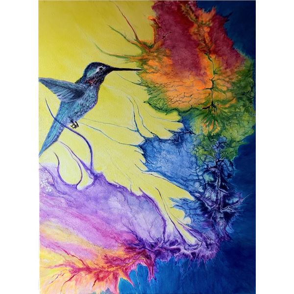 24x18 " original acrylic on stretched canvas featuring a humming bird. Says Katie D .: I love watching them in my yard, cautious but inquisitiv...