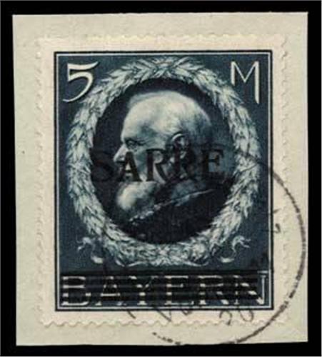 1920 ovpt on Bavaria 5m Prussian blue var small "A" in "SAARE" (Mi 30II) neatly tied to piece by faint Homburg Pfalz 10.Jun.20 cds, rare item one of only 600 possible, Ceremuga (2004) and Burger (2005) Certs, cat €2,400 (TAXABLE)