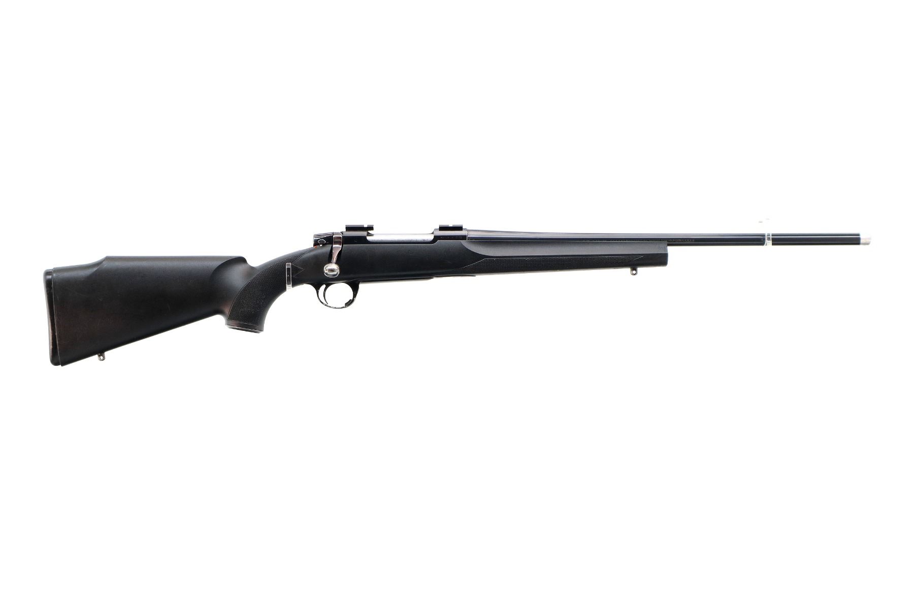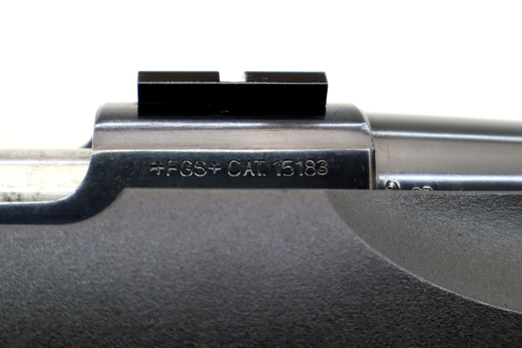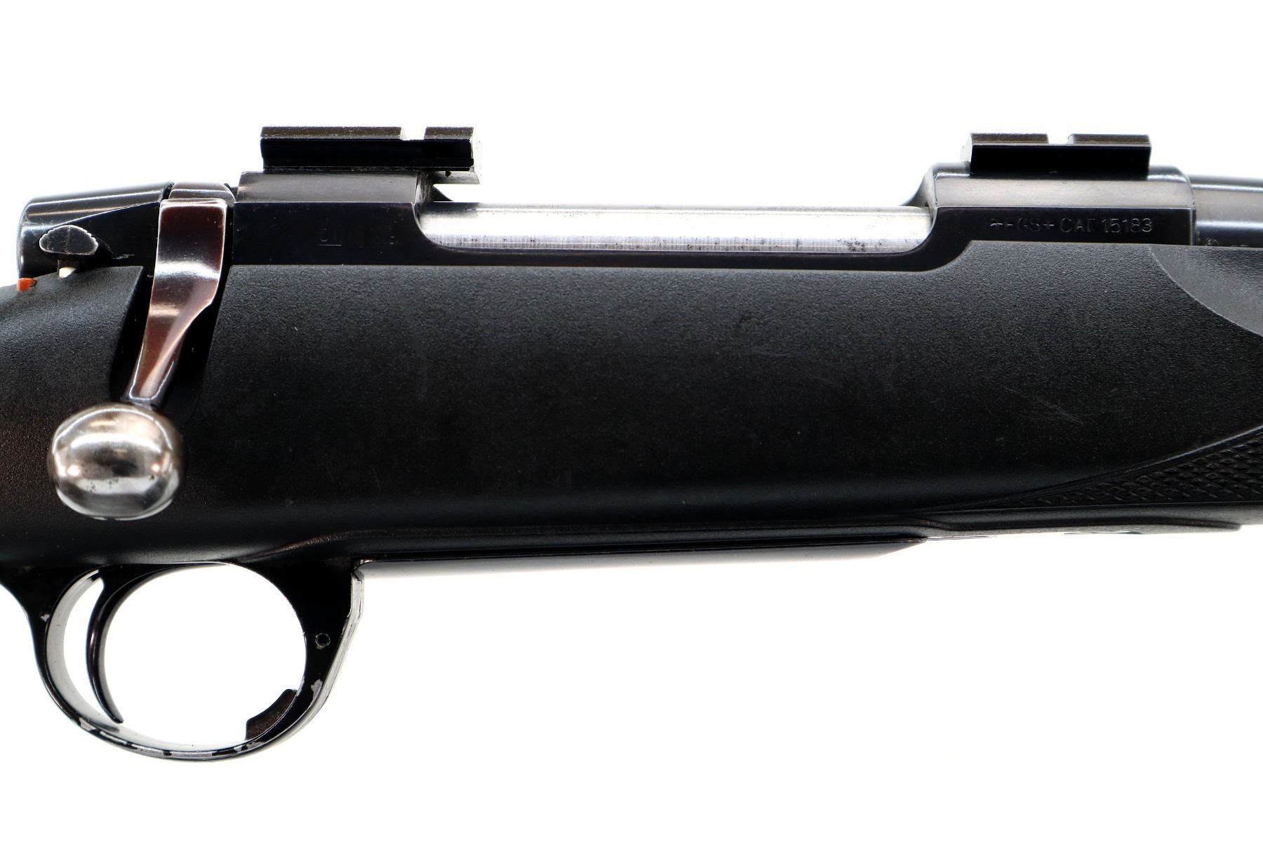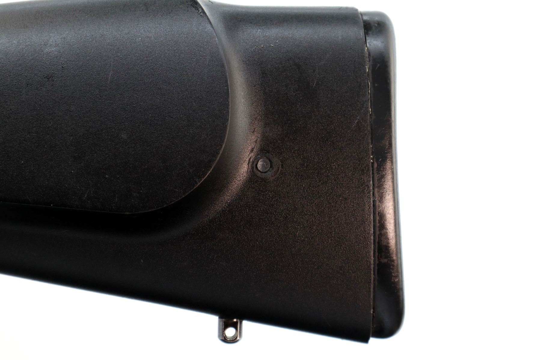 Main Description: No sights, blued finish, threaded muzzle with aluminum cap, receiver drilled and tapped with two piece scope bases installed, smooth bolt knob. One piece black synthetic stock, finger grooved checkered forearm and pistol grip with right hand palm swell, cheek rest, black rubber recoil pad, 14" LOP, grip cap, hinged floor plate, repaired hole in left side of stock, swivel studs.