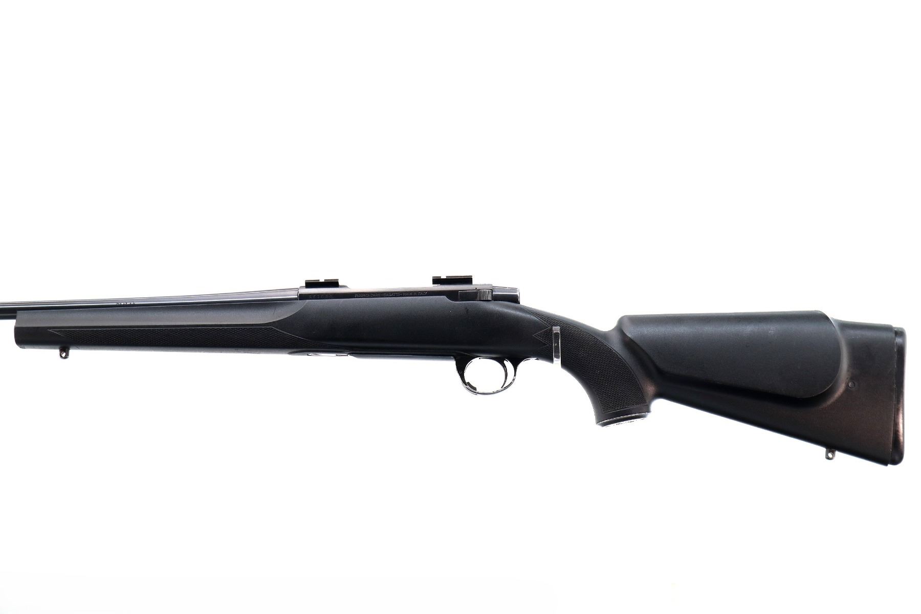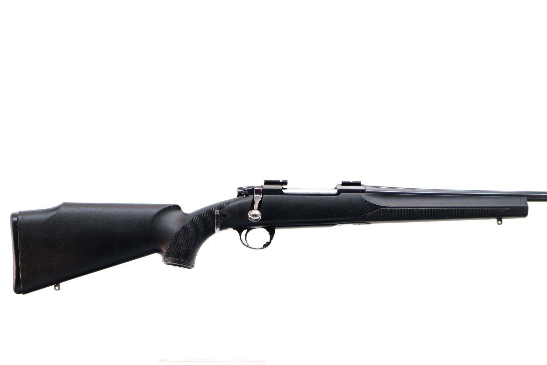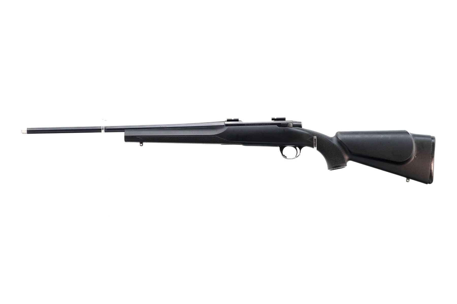 Main Description: No sights, blued finish, threaded muzzle with aluminum cap, receiver drilled and tapped with two piece scope bases installed, smooth bolt knob. One piece black synthetic stock, finger grooved checkered forearm and pistol grip with right hand palm swell, cheek rest, black rubber recoil pad, 14" LOP, grip cap, hinged floor plate, repaired hole in left side of stock, swivel studs.