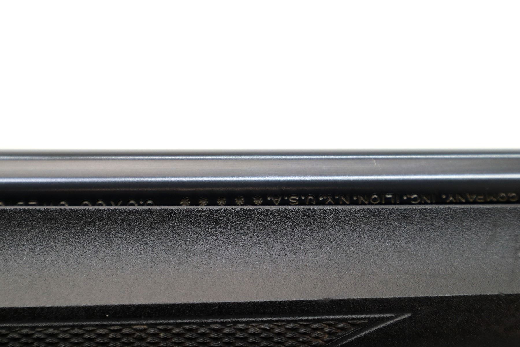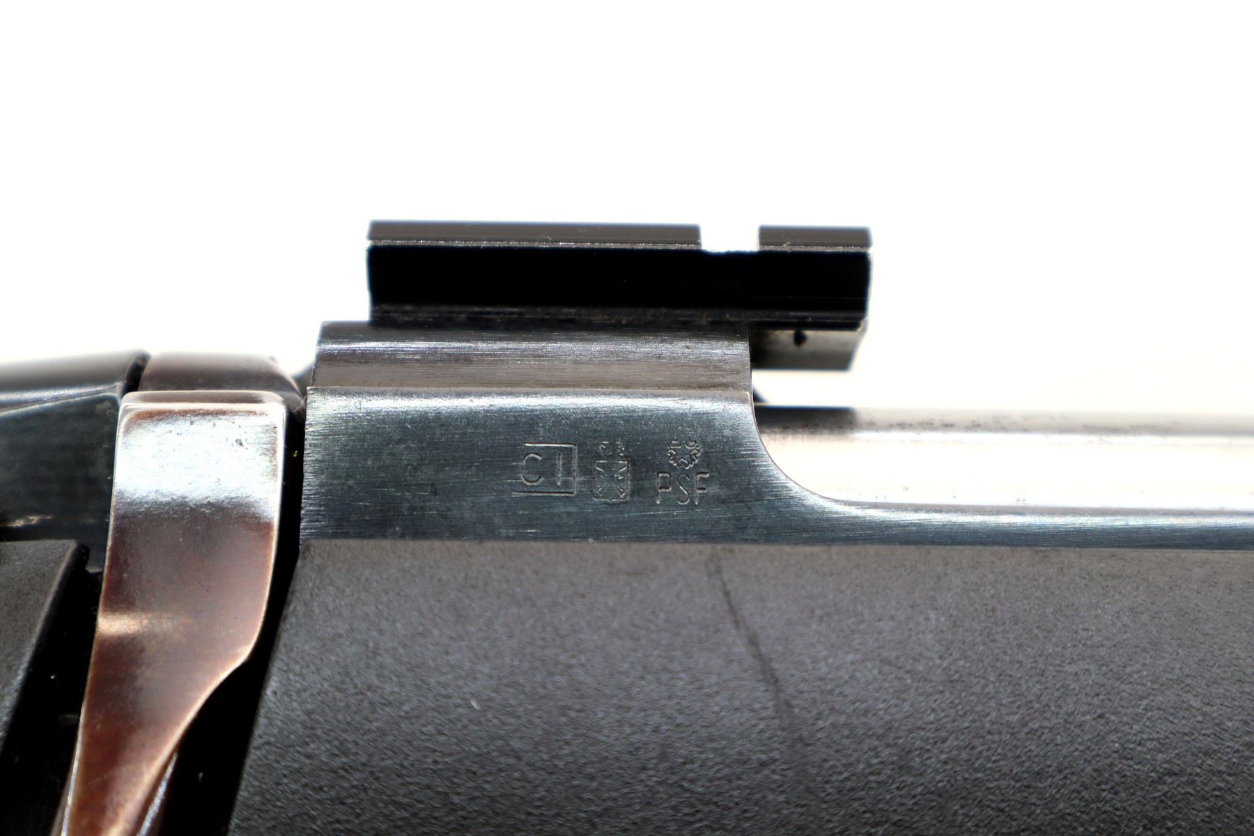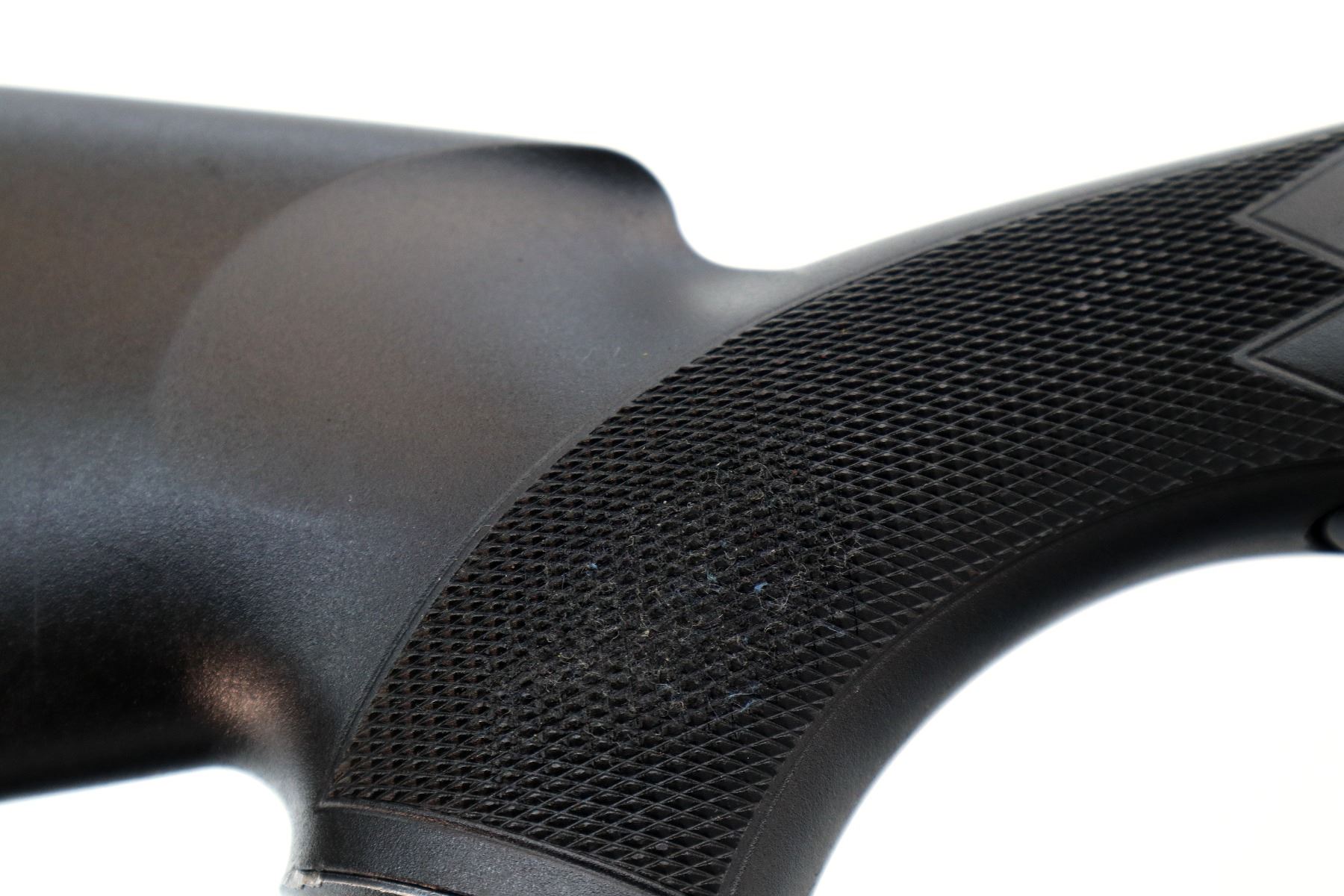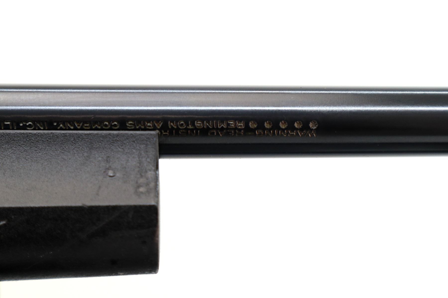 Main Description: No sights, blued finish, threaded muzzle with aluminum cap, receiver drilled and tapped with two piece scope bases installed, smooth bolt knob. One piece black synthetic stock, finger grooved checkered forearm and pistol grip with right hand palm swell, cheek rest, black rubber recoil pad, 14" LOP, grip cap, hinged floor plate, repaired hole in left side of stock, swivel studs.