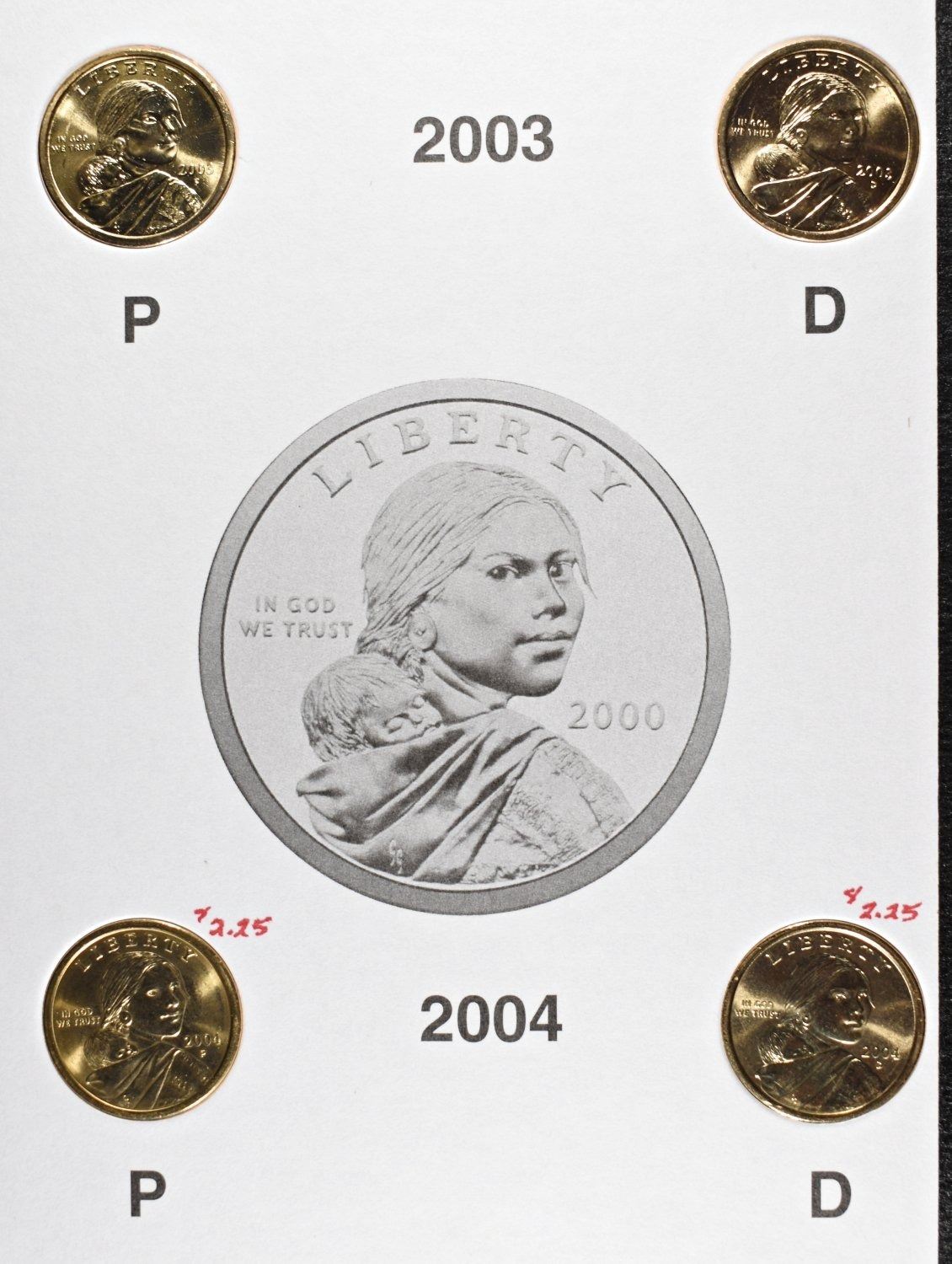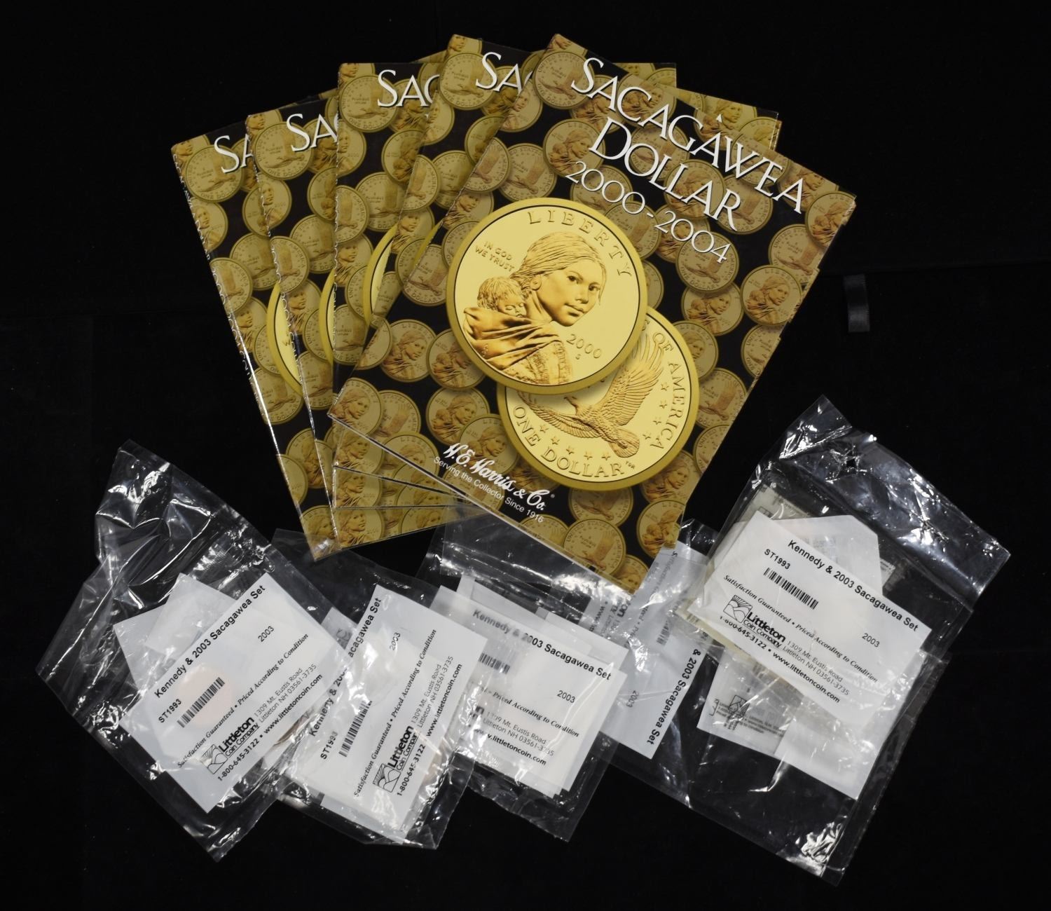 (5) 2003 KENNEDY AND SACAGAWEA SETS, (5) H.E. HARRIS&CO SACAGAWEA COMPLETE ALBUMS ESTIMATE $80 - $100.