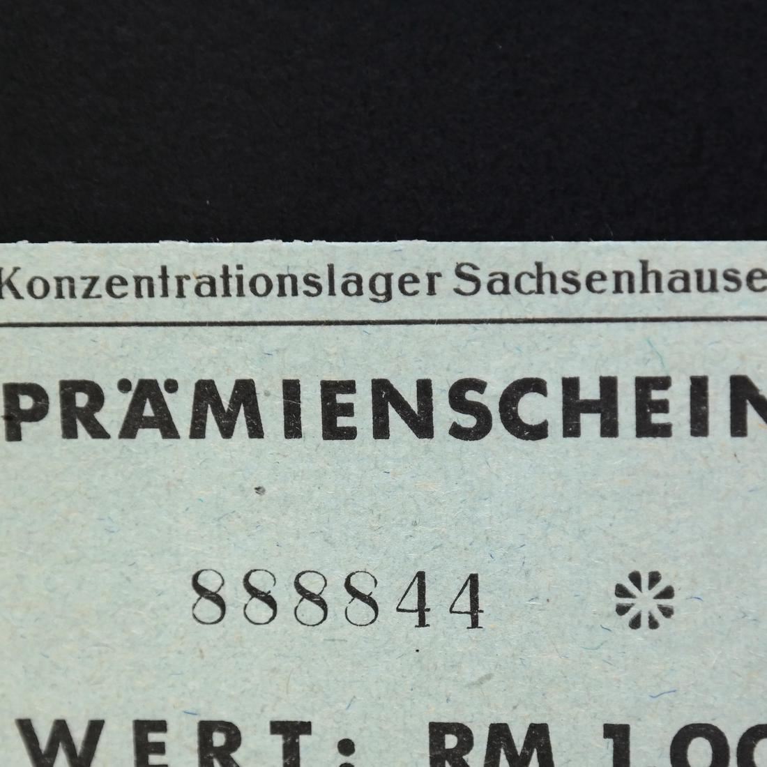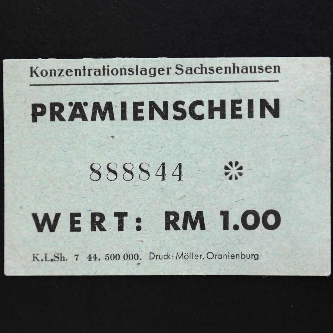 Konzentrationslager Sachsenhausen / Prmienschein / Wert: RM 1.00 on light bluish green paper, serial #888844, measures approx 71 by 47mm, sound and XF.