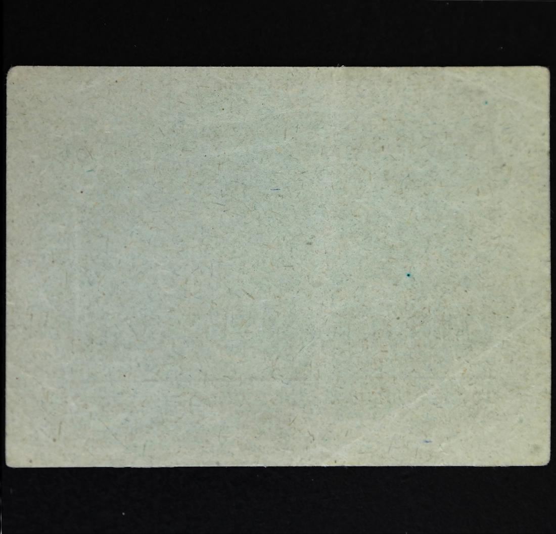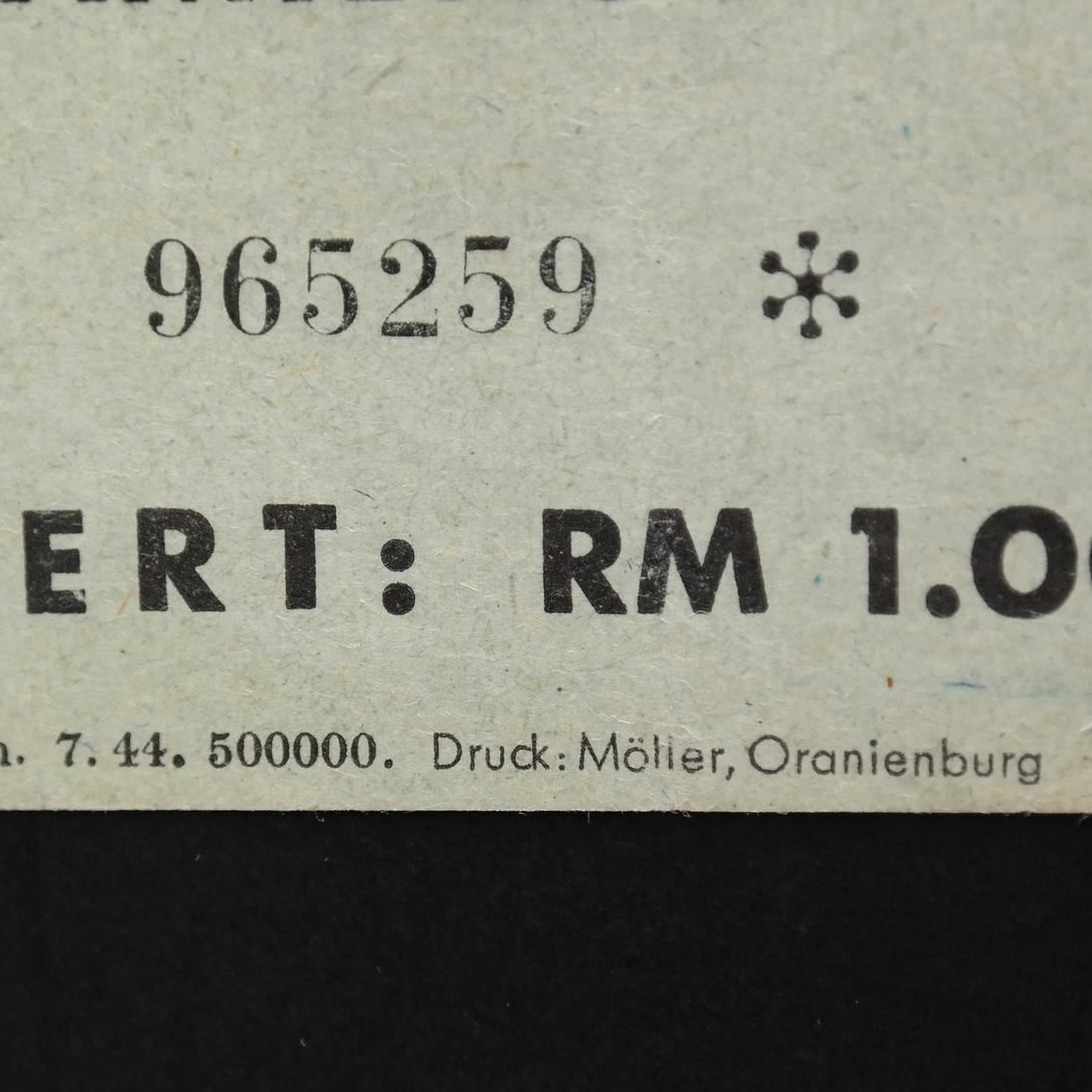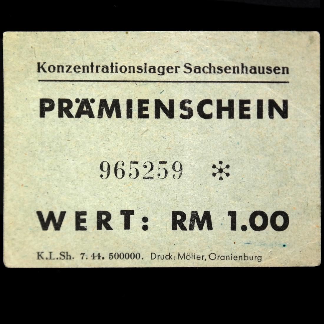 Konzentrationslager Sachsenhausen / Prmienschein / Wert: RM 1.00 on light bluish green paper, serial #965259, measures approx 68 by 51mm, light creases and one small edge tear, VF.