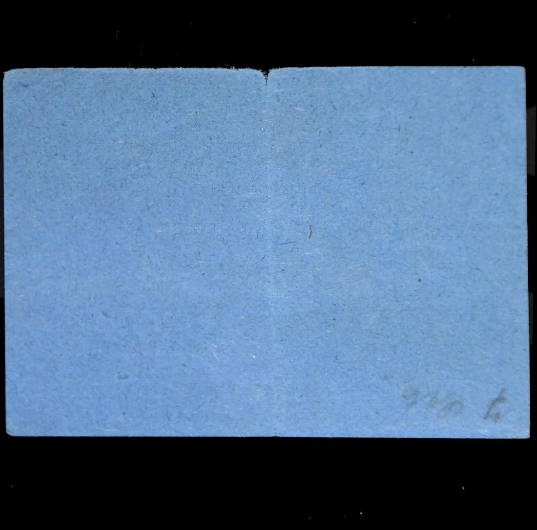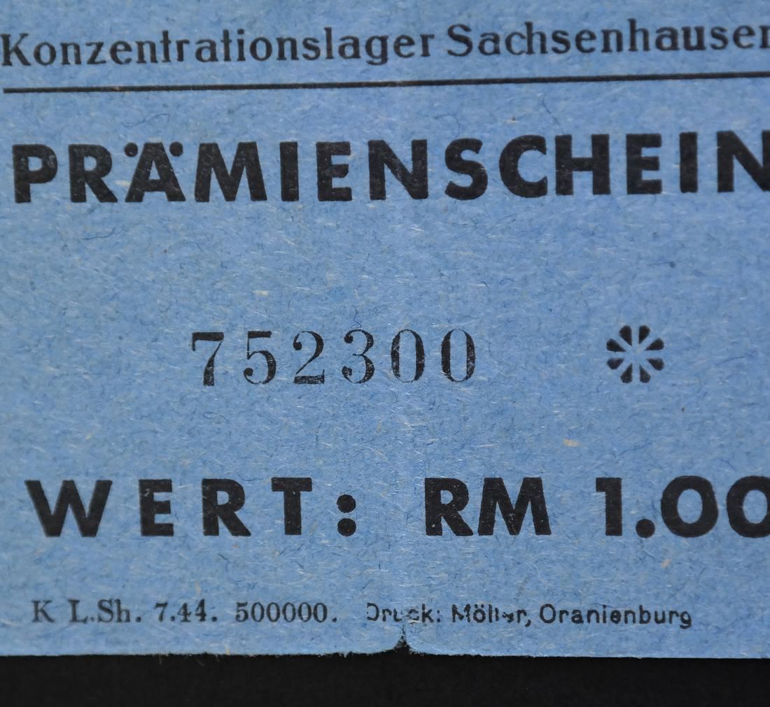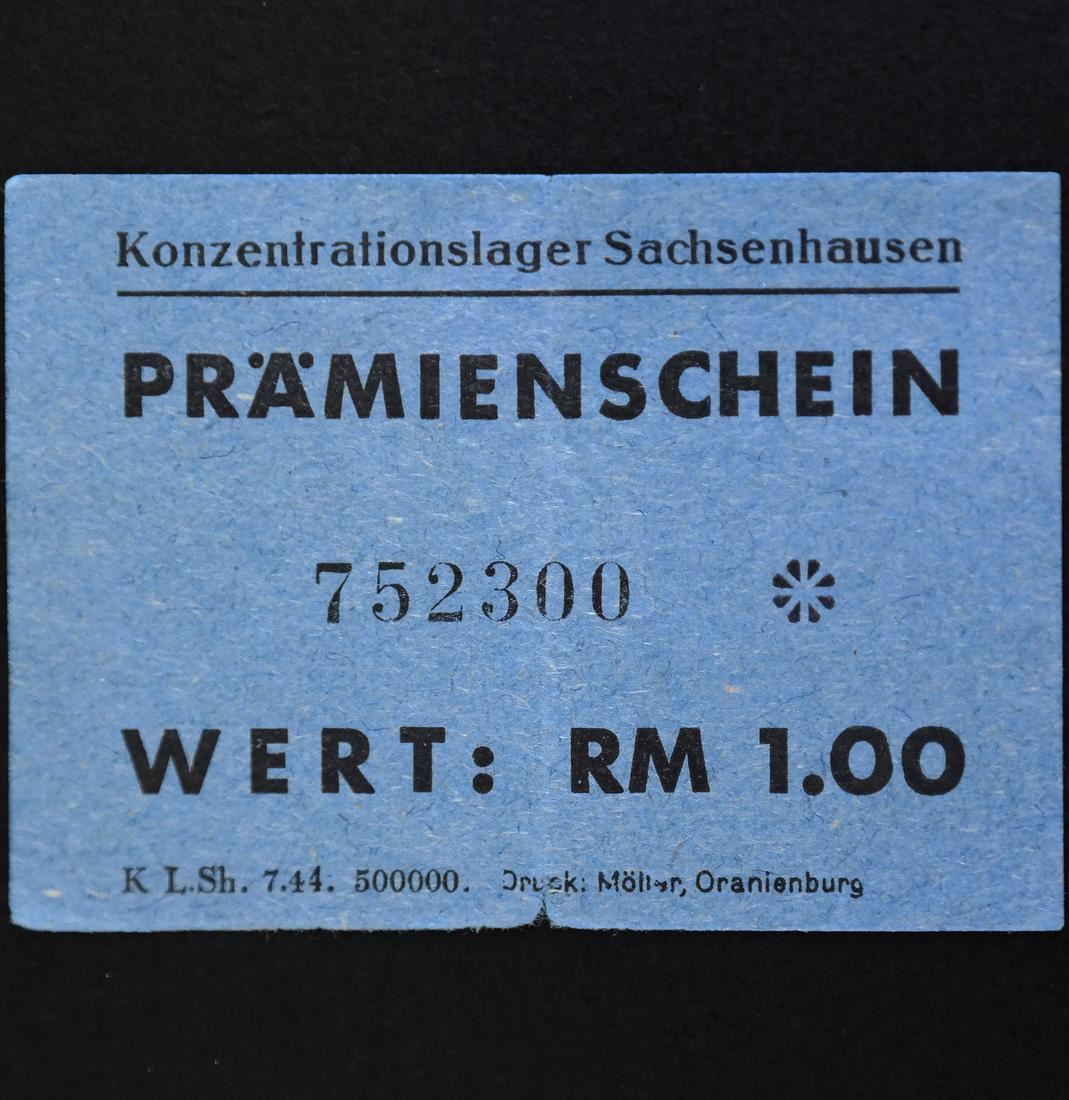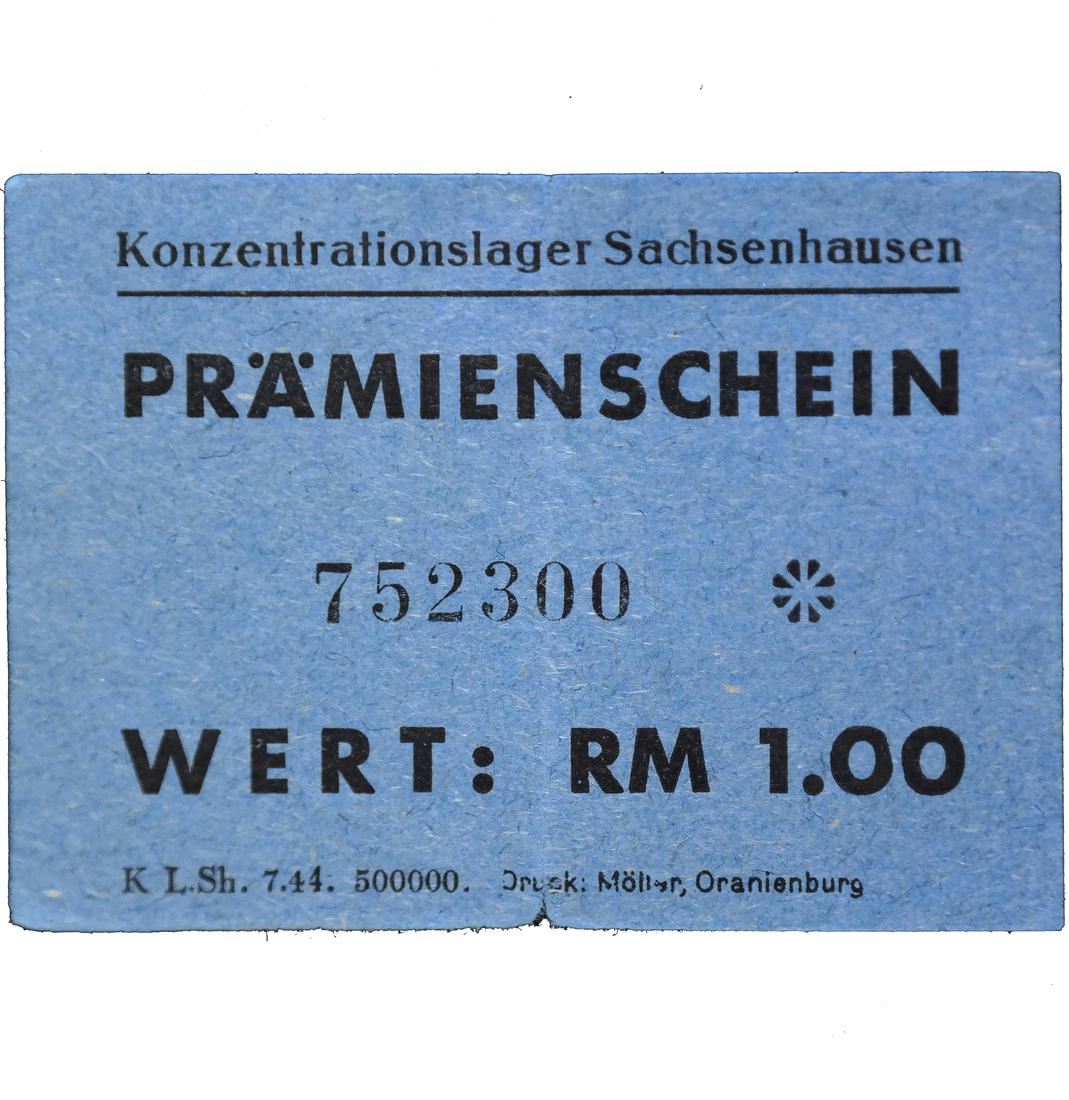 Konzentrationslager Sachsenhausen / Prmienschein / Wert: RM 1.00 on blue paper, serial #752300, measures approx 67 by 49mm, vertical center fold, some edge nicks and pencil notation on reverse, VF.