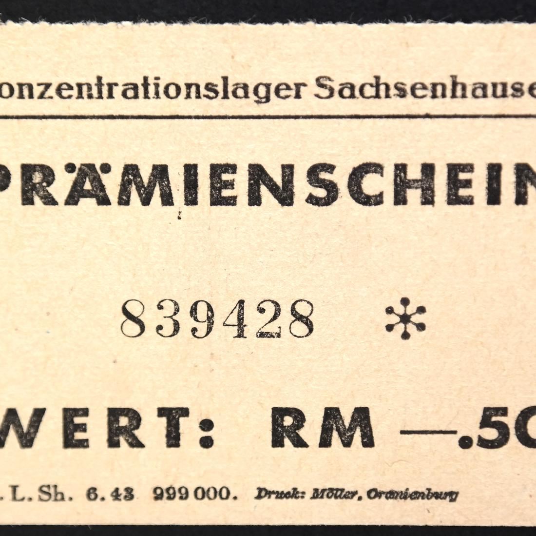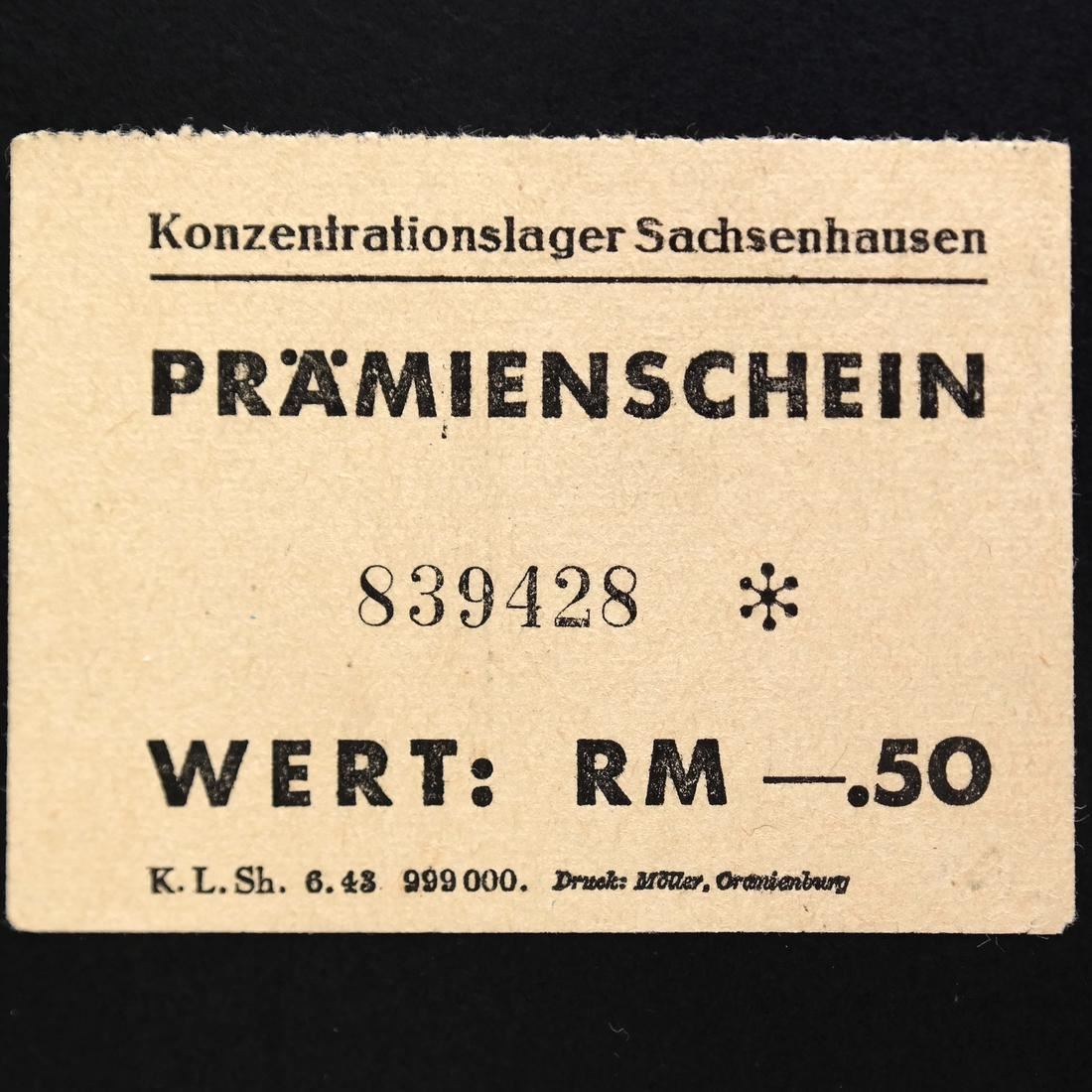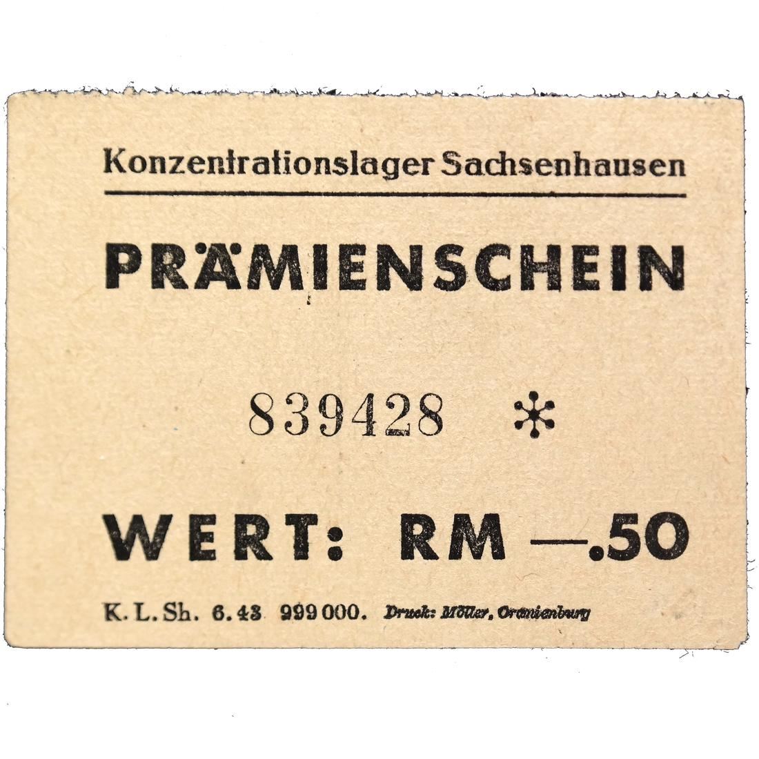 Konzentrationslager Sachsenhausen / Prmienschein / Wert: RM - .50 on cream paper, serial #839428, measures approx 68 by 50mm, sound and XF.
