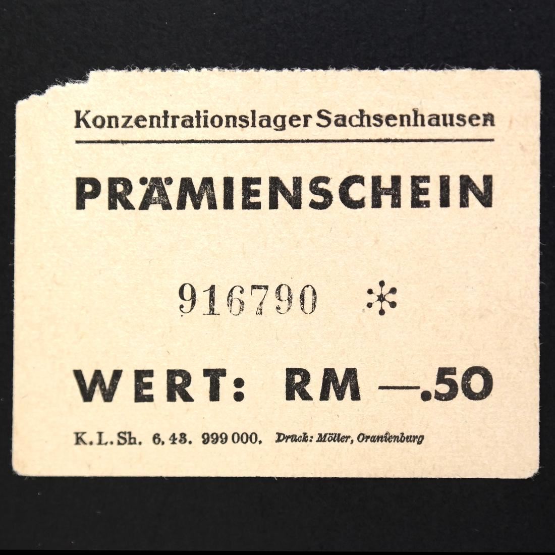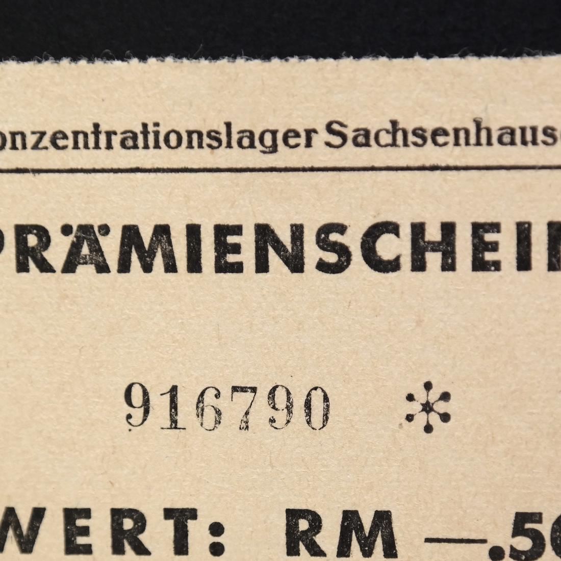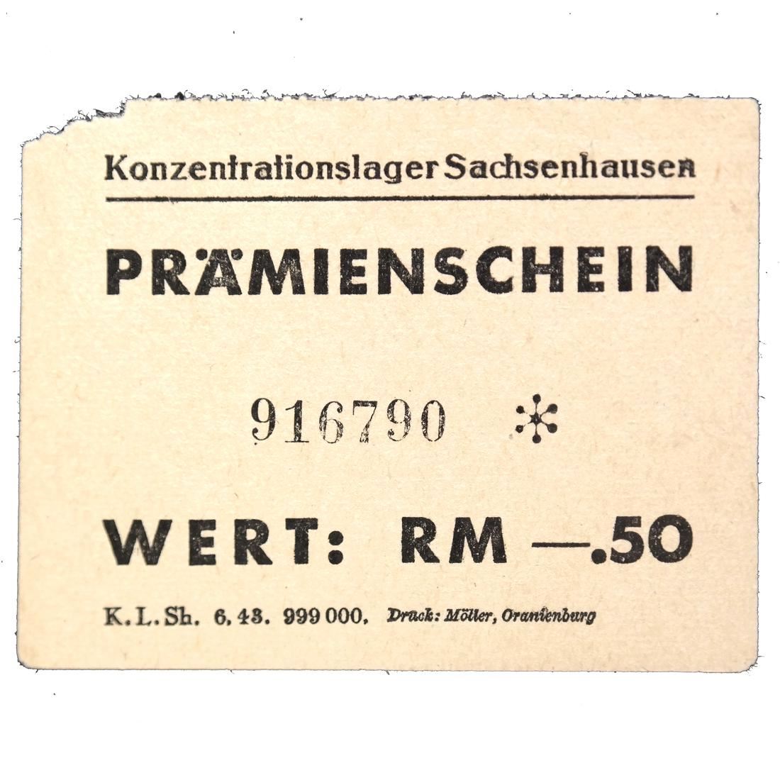 Konzentrationslager Sachsenhausen / Prmienschein / Wert: RM - .50 on cream paper, serial #916790, measures approx 68 by 53mm, small piece missing at upper left, otherwise VF.