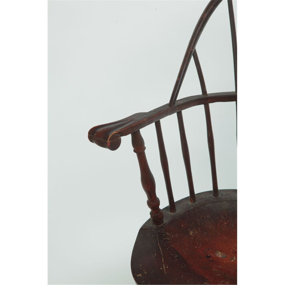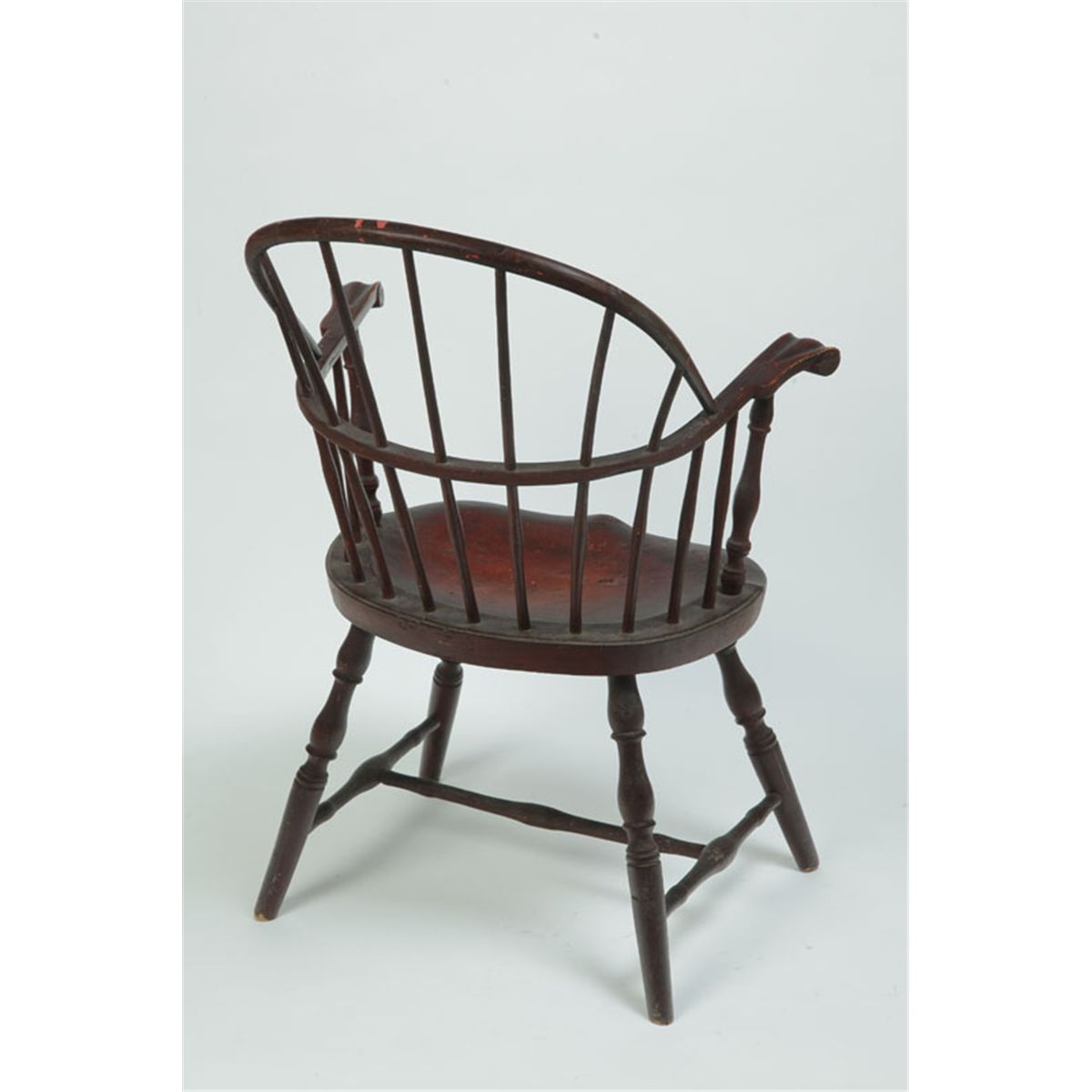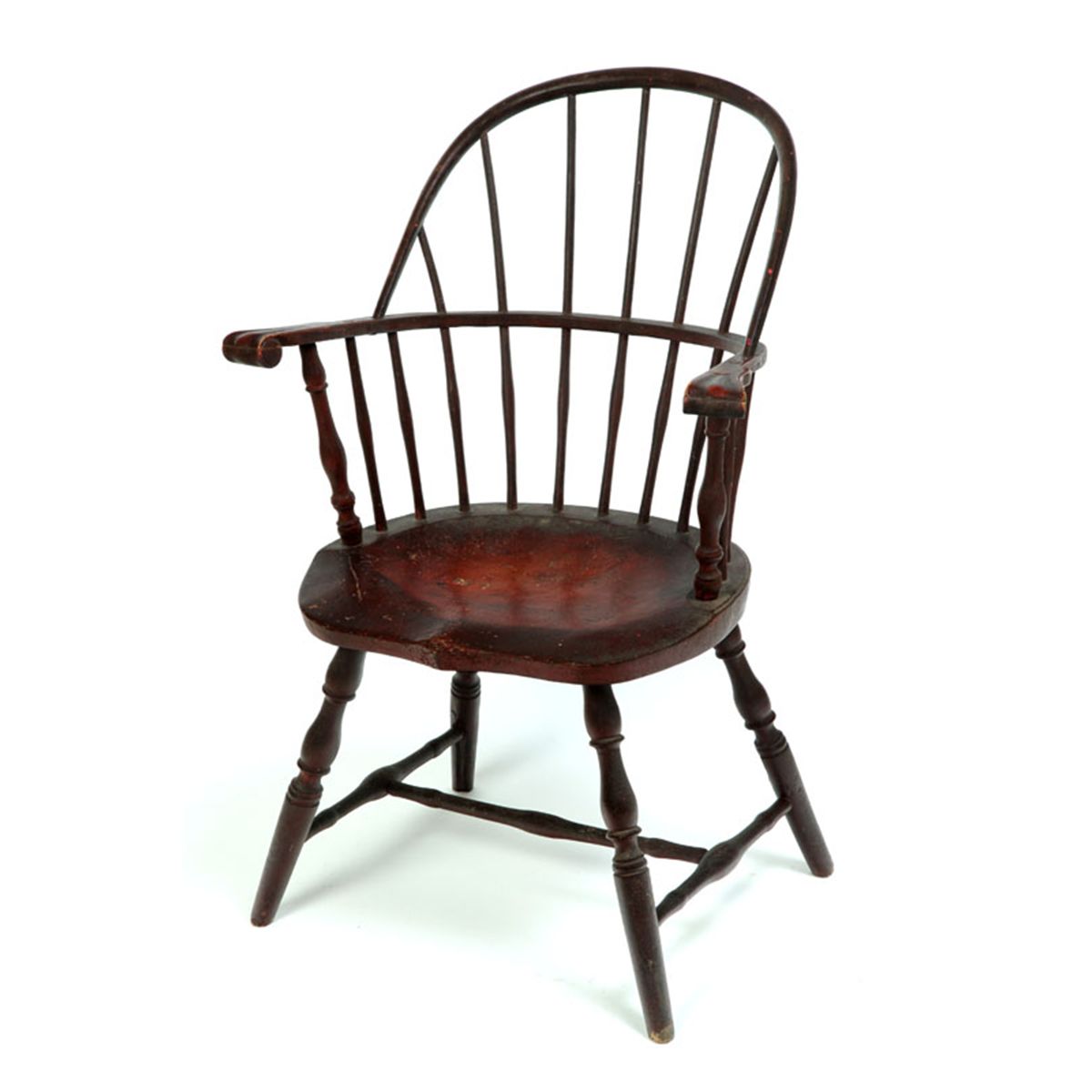 Connecticut, 1785-1795, mixed woods including pine. Knuckled arms, splayed baluster legs, and retaining an old reddish-brown over an earlier red. 15 3/4"h. seat, 34 1/4"h. overall. Ex David Good (Ohio).
