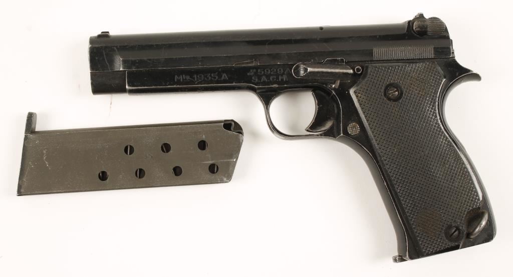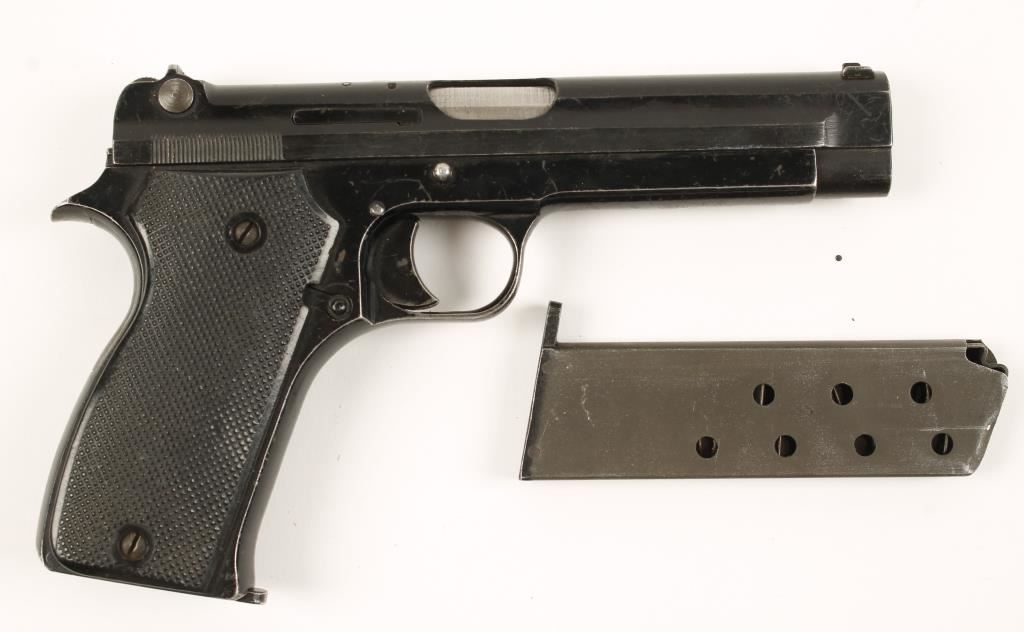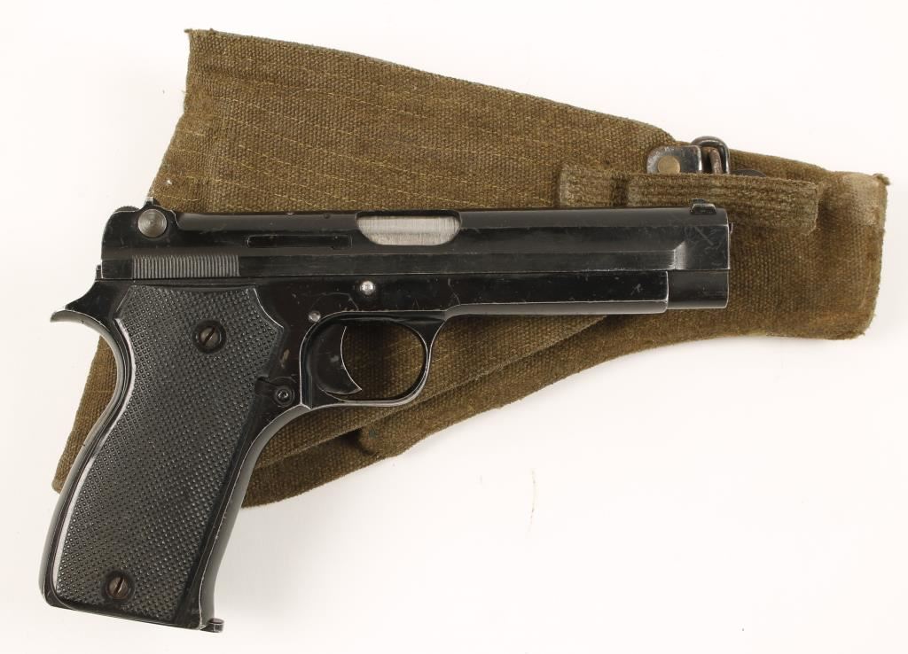 Black finished single-action semi-automatic pistol with a 4-1/2" barrel, two magazines and a canvas flap holster. Finish is like a black paint with edge wear and scratches. The checkered black plastic grips are complete in worn condition. Function is good. Bore is grey with sharp rifling. Holster is in good condition. Condition is good. *Modern Firearm*