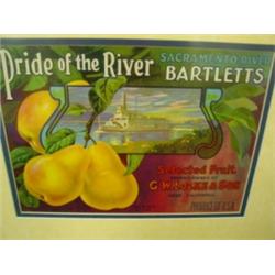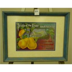 Fruit crate label.  Sacramento River Pears.  1940's.  Blue painted wood frame.  Image - 7-1/2" x 10-1/2".  Overall - 14" x 18".  Condition:  Excellent