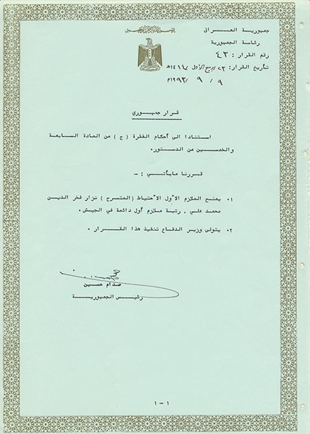 (1937 - 2006) President of Iraq who, in 1979, led Arab opposition to the Camp David Accords between Israel and Egypt. Under Hussein's direction, Iraq invaded Iran in 1980, in an attempt to gain control of the Strait of Hormuz. The attack led to a war of attrition, during which Hussein quelled a Kurdish uprising by the widespread use of chemical weapons. Partly-printed D.S. in Arabic on mint green letterhead, 1p. legal folio, untranslated, but apparently a letter of state. Tiny file holes at right margin, else fine.