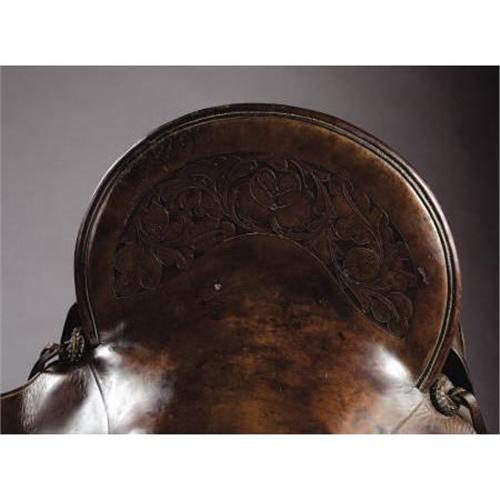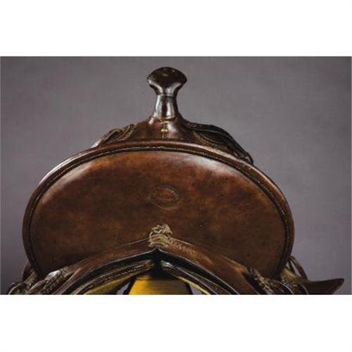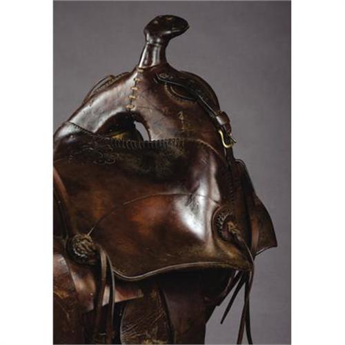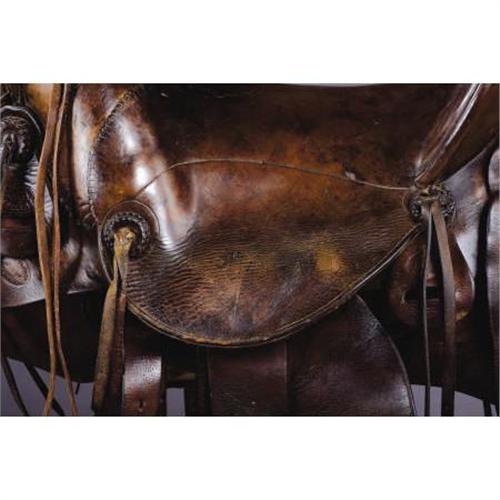 <B>SADDLE BY W.R. THOMPSON MAKER, RIFLE, COLORADO CIRCA 1888-1908</B></I> - Square skirts with built on marked saddle bags; double rigged; brass-bound oxbow stirrups; 15” seat; plain leather with floral carved seat; attached period scabbard.<BR><BR><B>Condition:</B></I> Very good overall.<BR><BR><b>Shipping:</b> Other (oversized items, group lo (<a target="_blank" href="http://www.heritageauctions.com/common/shipping.php">view shipping information</a>)