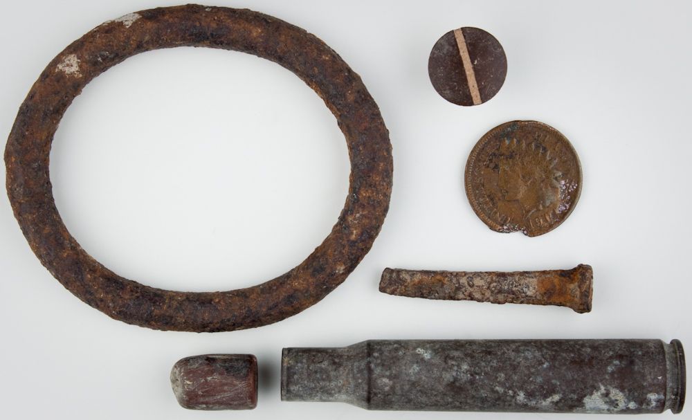 A neat group of relics recovered from the legendary town of Tombstone, Arizona. The first is saddle ring measuring 2 1/4" x 2" oval and crafted from heavy-gauge metal (found in the 300 block of Fremont St. near the site of the gunfight of the O.K. Corral). Along with a nail measuring 1 1/2" (recovered at 2nd and Safford Sts.); a bullet and casing (4th and Allen Sts.) and a (damaged) Indian Head penny (4th and Fremont Sts.). All are oxidized, as expected, overall very good. With COA from an unidentified relic hunter.