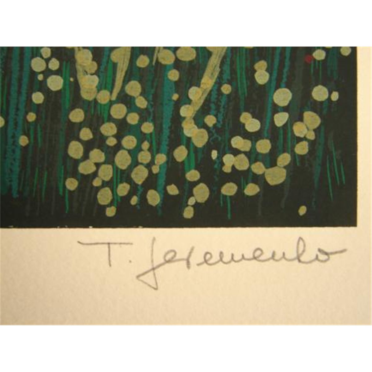 Ted Jeremenko is the creative talent behind this deceptively simple "primitive" landscape: * Title: "Sagaponack" * Serigraph on ivory Arches * Sheet size: 20½ × 27¼ * Image size: 16 × 23 * Signed by the artist in pencil LR * Numbered from a limited edition LL * Bright and fresh gallery condition; never mounted, matted or framed * Certificate of Authenticity issued by Midwest Estate Buyers * * Born in Yugoslavia in 1938, Ted Jeremenko's family emigrated to the US in 1950. His work brilliantly straddles the primitive and the contemporary and the artist strives to celebrate simple values. His early training in architecture helps him to pare a landscape down to its essentials, producing very pleasing and appealing results. "I paint primarily for myself," says the popular self-taught artist, "but it is very gratifying to know that my artwork touches other people." * * This very handsome and representative print will make a welcome addition to any collection or décor!