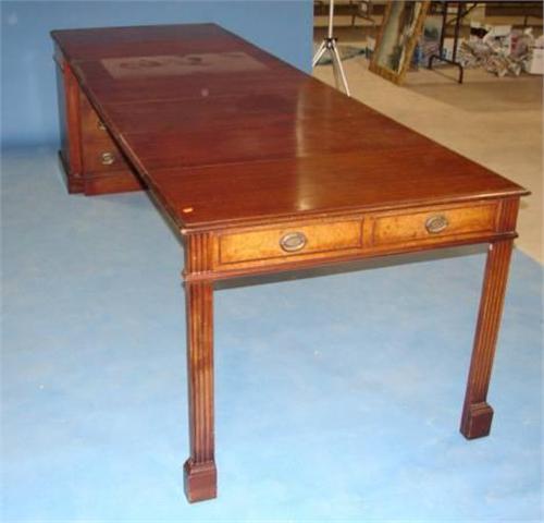 SAGINAW MAHOGANY BUREAU STYLE EXTENSION TABLE. Has 6 leaves. Shows some surface scratching. 30” H, 36” W, 20” D. Fully extended 110.5” L