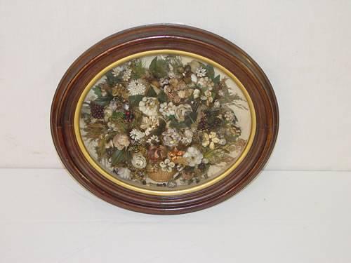 SAILORS MADE TYPE BASKET OF FLOWERS MADE OF SHELLS IN DEEP WALNUT FRAMED SHADOW BOX (14 1/2" X 12 1/2"), PAPER LABEL ON BACK FROM B.W. PIERCES NEW BEDFORD MA - LOSSES TO SHELLS;