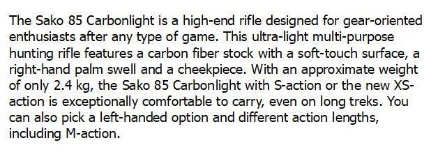 ACTION: Sako 85 actions come in six different sizes (CSA), providing reliable functioning for each caliber. All Sako 85 models feature controlled cartridge feed (RCS) to eliminate double feed or cartridge jams. The turn-bolt handle places the hand in a natural position during bolt operation, which allows for rapid repeated firing.