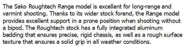 The Sako Roughtech Range model is excellent for long range and varmint shooting. Thanks to its wider stock fore end, the Range model provides excellent support in prone position when shooting without a bi-pod. The Roughtech stock has a fully integrated aluminum bedding that ensures precise, rigid chassis, as well as a rough surface texture that ensures a solid grip in all weather conditions.