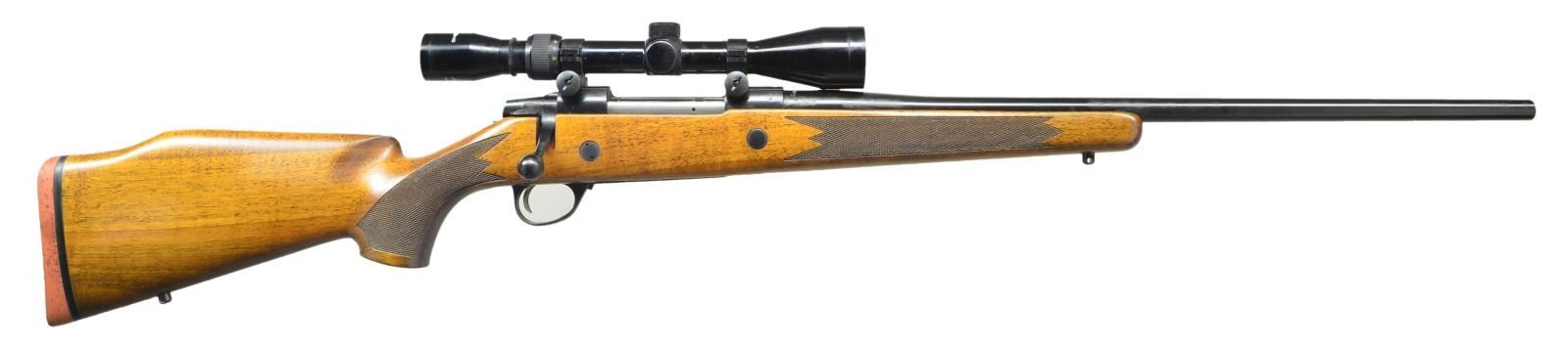 Cal. 375 H&H mag. S# 588031. Bbl. 23" sightless with Stoeger import markings. 2 Lug action with top tang safety, cocking indicator & hinged floorplate. Left side of action marked "SAKO AV". Tasco 3-9x40 gloss finished scope with duplex reticle on Sako rings. Monte Carlo cheekpiece walnut stock with steel stock bolts, cut checkering, swivel bases & original solid red pad. Weight: 8 lbs, 9.2 oz with scope. CONDITION: over 98% original blue. Stock finish shows scattered mildew spots. Bright near excellent bore. Scope has good optics. (22-3687/DS). MODERN. $1,500-2,000.
